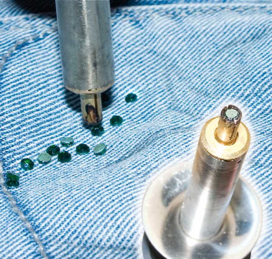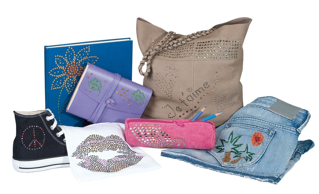 Designer-Geschenk-Set inkl. Strass und Nieten - sofort start! Designerstücke selbst entwerfen Mit dem Kolben werden die mit Heißkleber beschichteten Strass-Steine und Nieten erhitzt und lassen sich individuell platzieren. Verziert werden können Stoff, Leder, P...