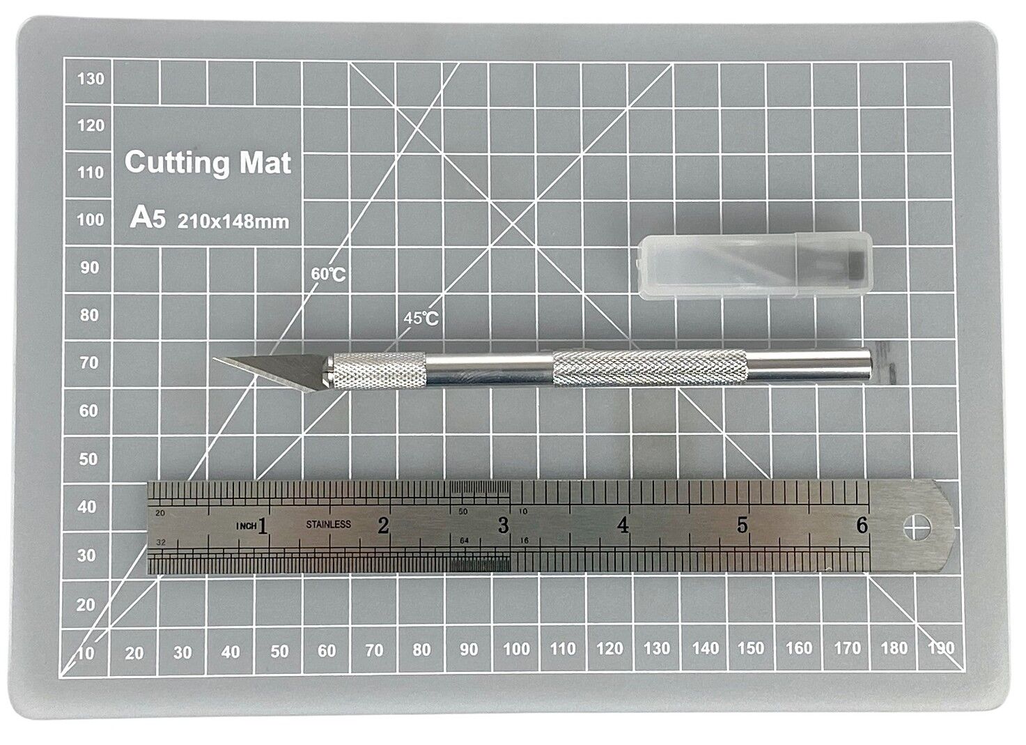 Bastlerset inkl. Schneidematte 21 x 14,7 cmtransparent mit Metall-Lineal, Bastlermesser mit 6 Klingen - 8-teiliges Cutter-Set zum Basteln, Modelieren und Heimwerken. Perfekt zum präzisen Schneiden. - Bastelmesser mit praktischem, rutschfestem Griff - 5 Messerk...
