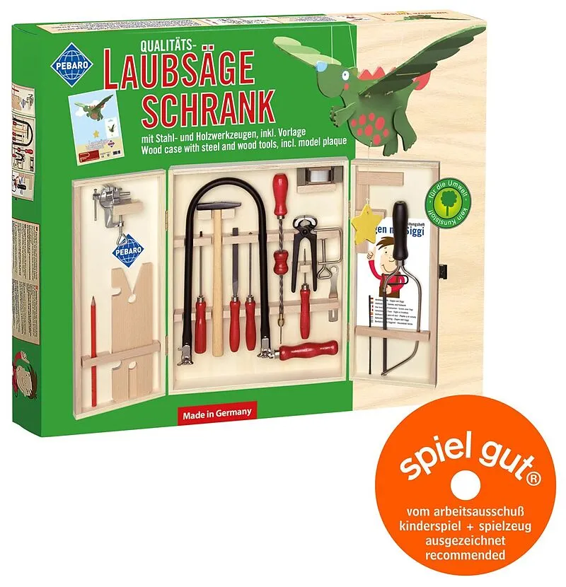 Öko-Laubsägeschrank, 24 Teile. Öko? Logisch! Für den umweltbewussten Kunden ganz ohne Kunststoffteile. Laubsäge mit Stahlflügelmuttern, Laubsägetischchen mit Einspannhalterung aus Holz, Laubsägeblätter, Laubsägeschlüssel, Laubsägevorlage aus Holz fliegender Dr...