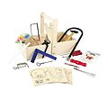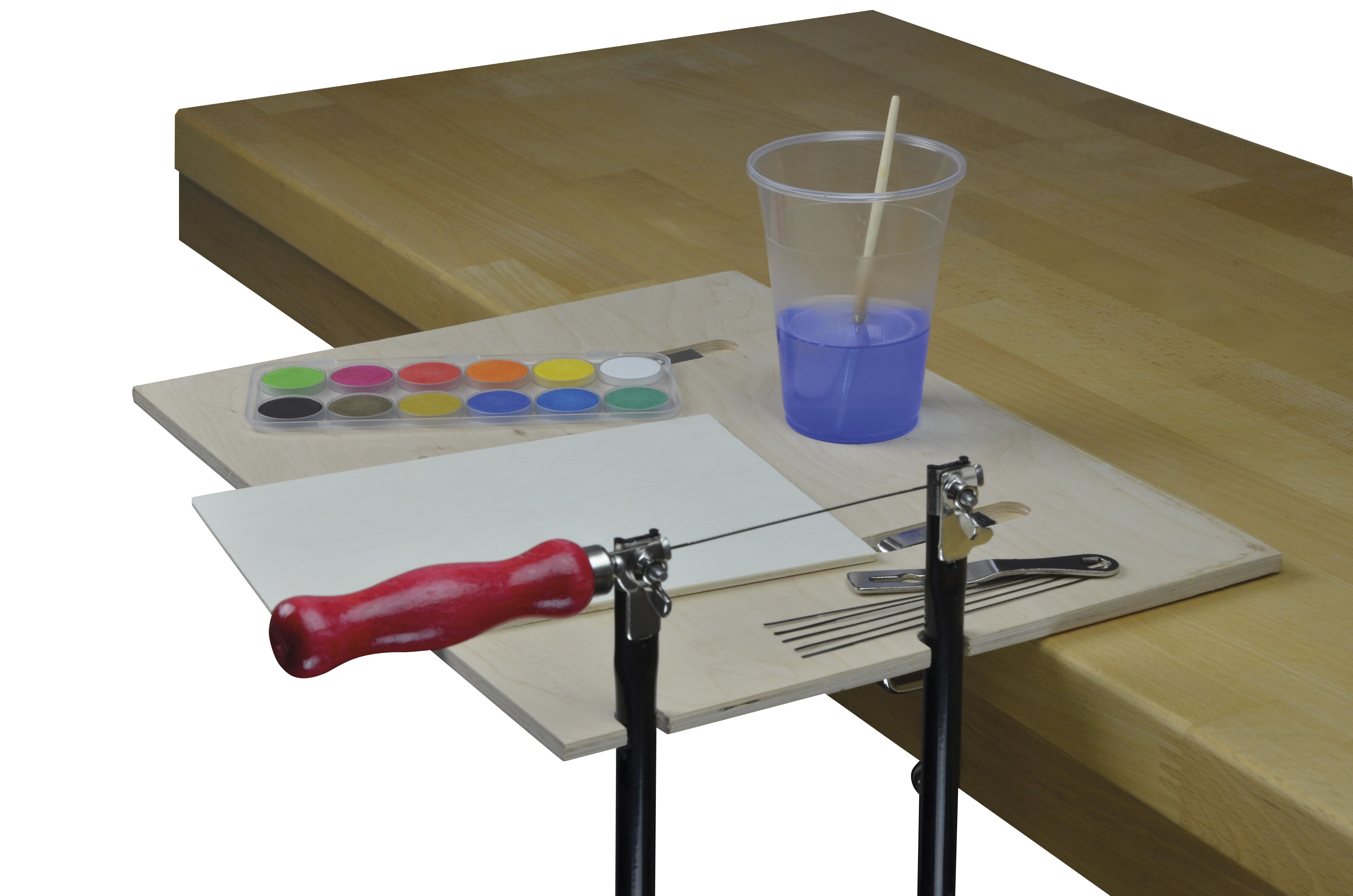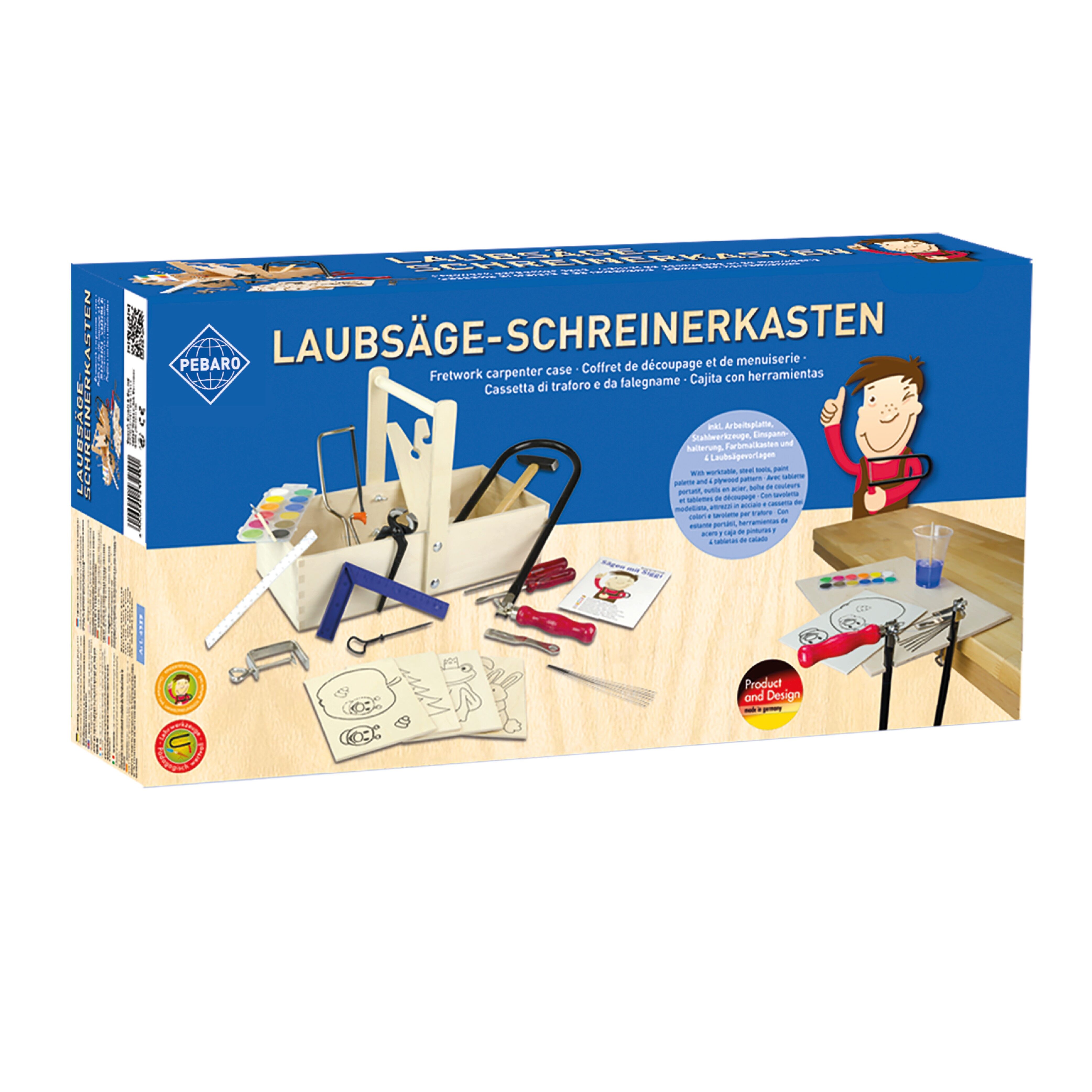 KOMPLETTES SET Hochwertiges Laubsäge-Set in praktischer Holzschreinerkiste mit Stahlwerkzeugen separater Arbeitsplatte und Farbkasten, verpackt im Karton LAUBSÄGEWERKZEUG Laubsäge, Laubsägetischchen mit Einspannhalterung aus Holz, Zwinge, Laubsägeblätter, Laub...