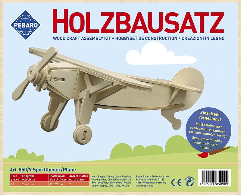 PEBARO 850/9 - Holzbausatz Sportflieger, Flugzeug, 28 Teile, Holzkonstruktion zum Zusammenstecken
