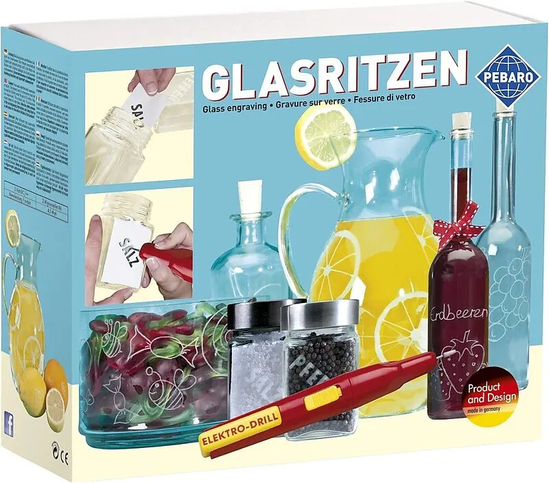 PEBARO Bastelset Glasritzen Glasritz-Geschenk-Set inkl. Gläser Batteriebetriebener Gravierstift, 2 Gläser, Flachzange, Handgravierstift, Glasschreibestift, spitzer keramischer Schleifstift (Art. 1610/3), 2 diamantierte Schleifstifte (Art. 1710 / 1714), Kontras...