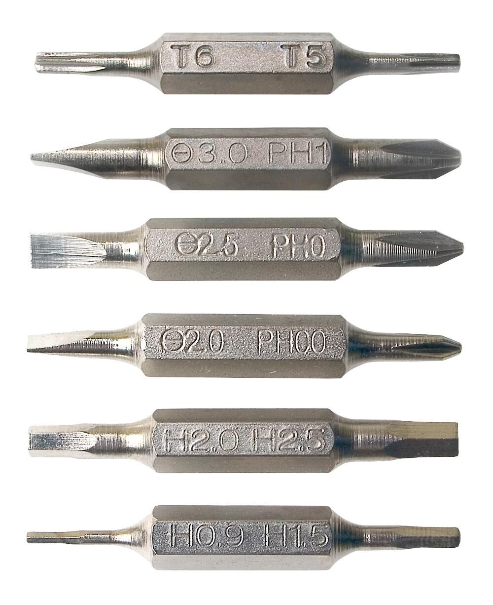 3 Schlitz 2,0 / 2,5 / 3,0 mm, 3 Kreuzschlitz Typ PH00 / PH0 / PH1, 4 Sechskant 0,9 / 1,5 / 2,0 / 2,5 mm, 2 Torx T5 / T6