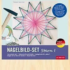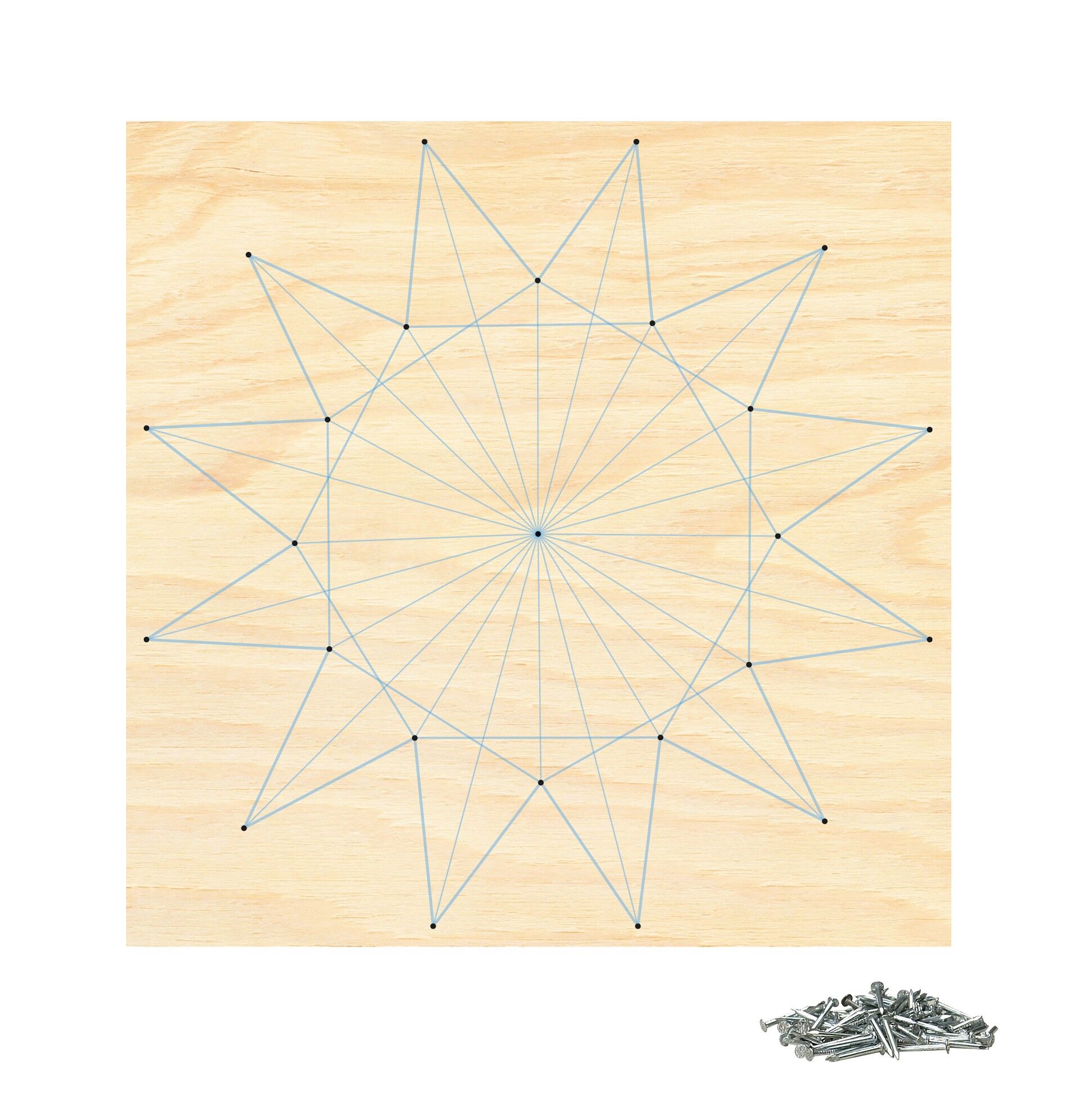 Nagelbild, Fadenbild mit Motiv Stern I Inhalt: - Nagelbild Stern I - 15 mm Pappelsperrholz 20 x 20 cm mit Druck - inkl. Nägel So gehts: Nägel in vorgedruckte Punkte einschlagen. Das Garn mit einem Knoten am Nagel befestigen. Zuerst den Faden an der Außenlinie ...