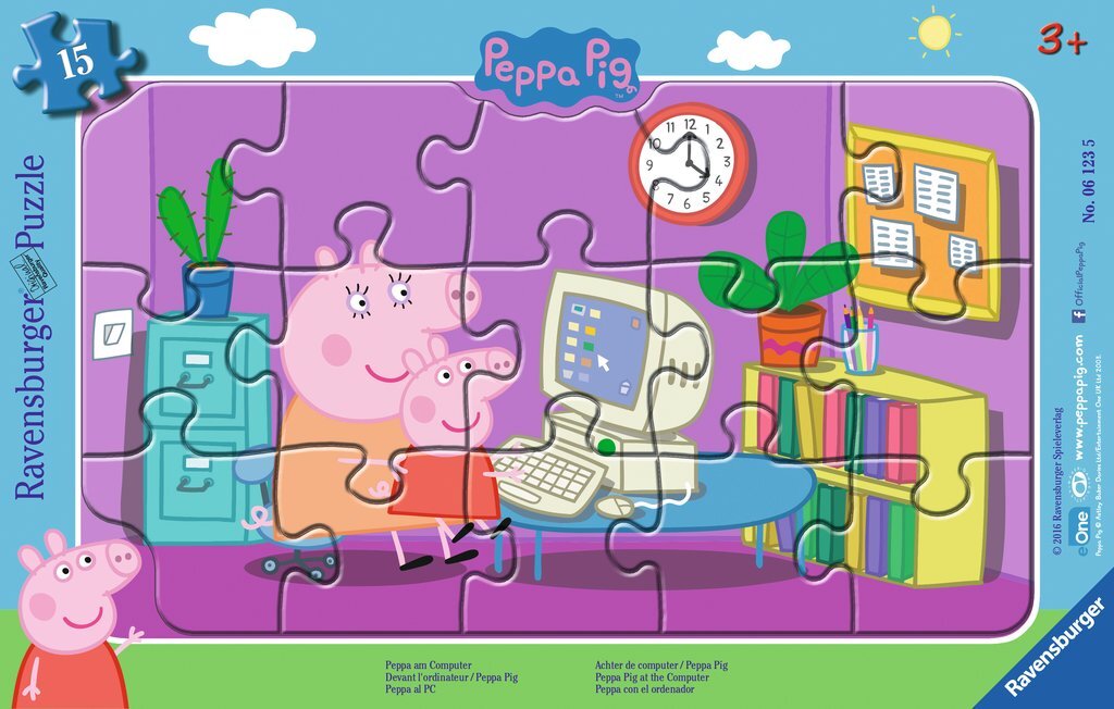 Ravensburger 6123 Puzzle Peppa am Computer 15 Teile Wohin gehört diese Ecke? Passen diese Puzzleteile zusammen? Rahmenpuzzles sind durch die Anzahl und Größe ihrer Teile ideal für Puzzleanfänger ab 3 Jahren geeignet. Der Puzzlerahmen mit den Konturlinien der P...