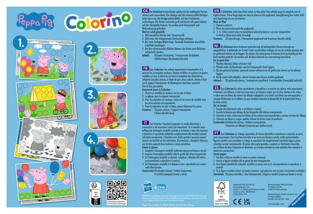 Colorino ist ein Klassiker unter den Steckspielen. Mit den Peppa Pig Bildvorlagen und den 23 robusten Stecksteinen sorgt dieses Farben-Lernspiel für großen Spielspaß bei Kindern ab 2 Jahren. Eine Bildvorlage wird unter die durchsichtige Stecktafel gelegt. Jetz...