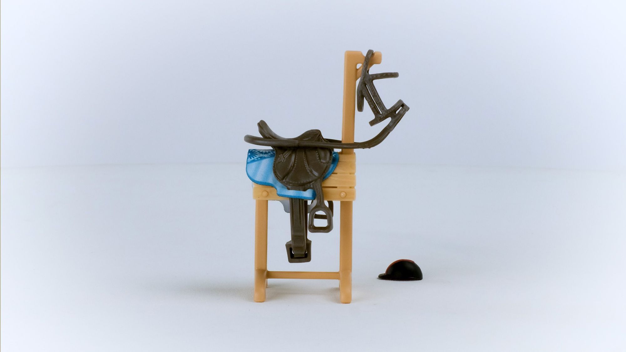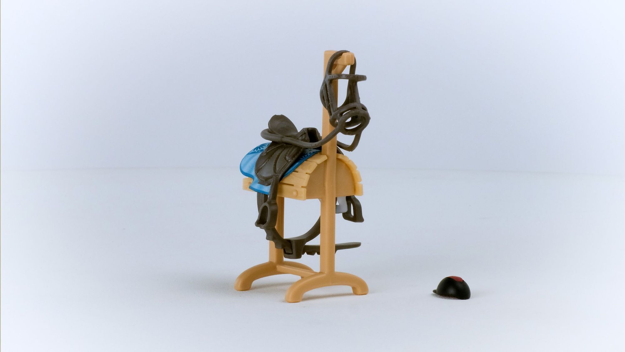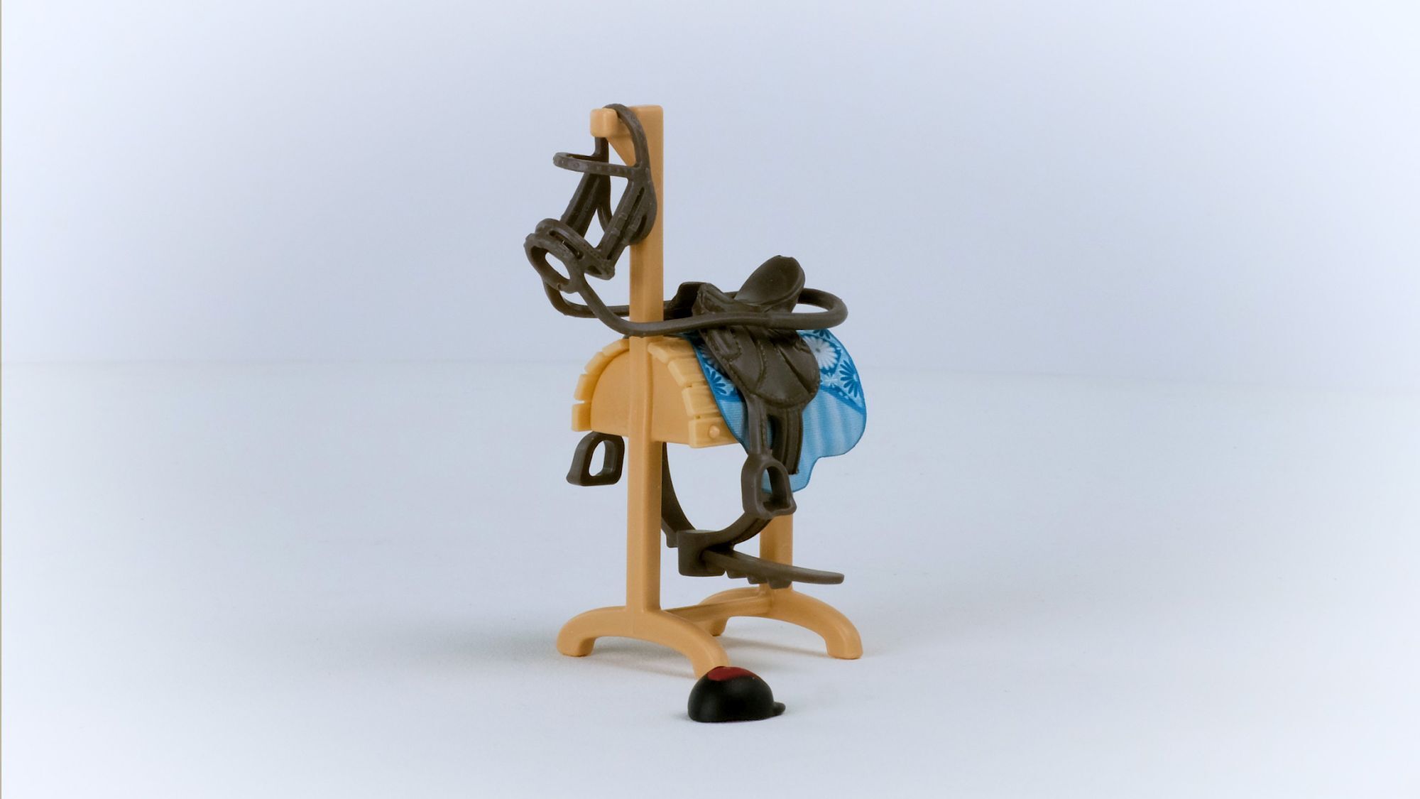 Wie praktisch! Auf dem Holzpferd kann man den Sattel und die Pferdedecke ablegen, wenn sie nicht gebraucht werden. Und das Zaumzeug ist ebenfalls mit einem Griff zur Hand, wenn das Pferd für den nächsten Ausritt vorbereitet werden soll. So bleiben Sattel und G...