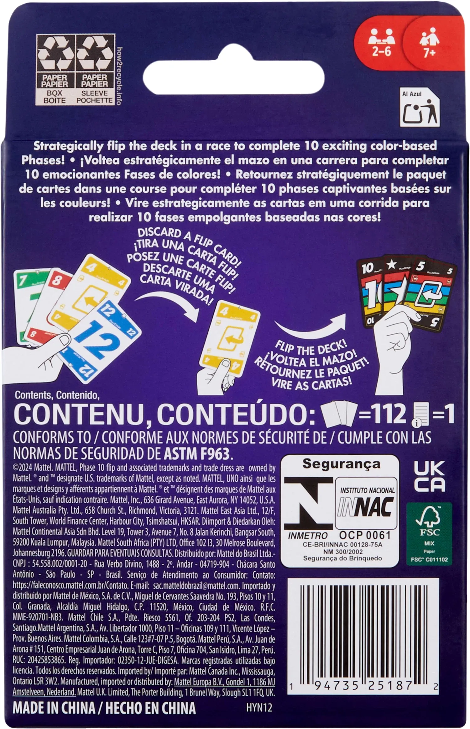Phase 10 Flip Phase 10 Flip, entwickelt von den Machern des Kartenspiels UNO, stellt den Kartenspielklassiker Phase 10 buchstäblich auf den Kopf! Die Spieler müssen auch hier so schnell wie möglich 10 Phasen abschließen, jedoch warten einige unerwartete Wendun...