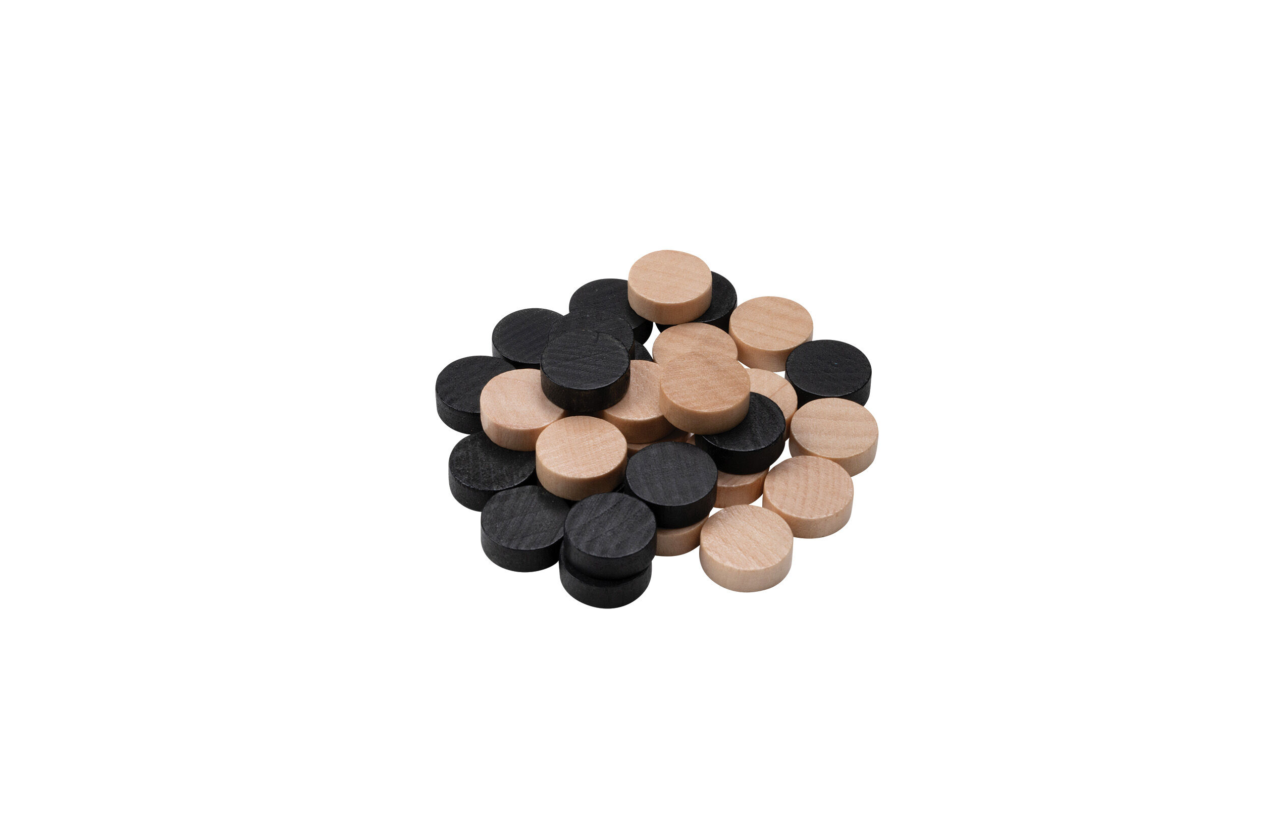 Klappbares Spielbrett, MDF, Maße 232 x 116 x 12 mm, bedruckt, mit Spielsteinen und Würfel.