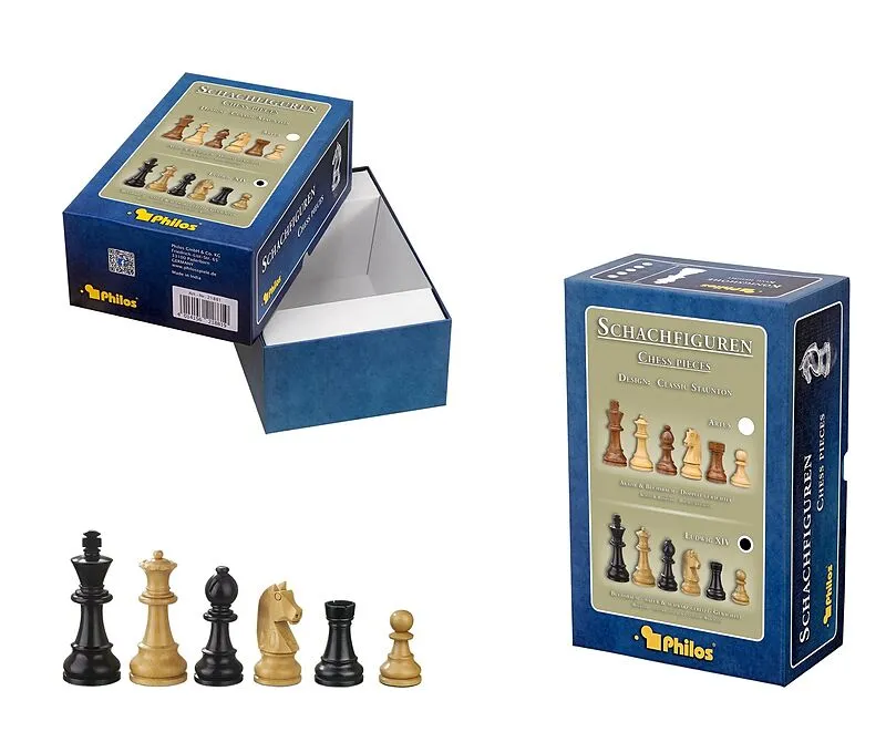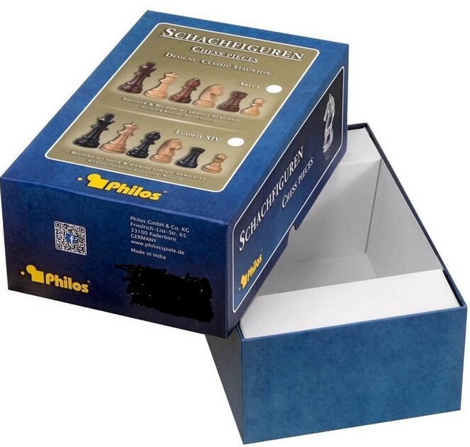 Staunton-Schachfiguren, Königshöhe 90 mm, Buchsbaum, natur und schwarz gebeizt, handgeschnitzter Springer, gewichtet, Ledersockel, in Set-up Box