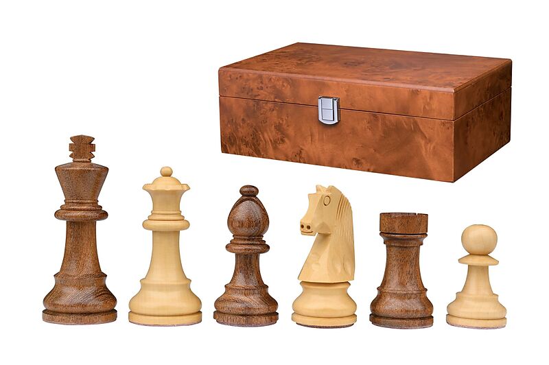 Design: Staunton, Königshöhe 110 mm.Sheesham und Buchsbaum natur, poliert,handgeschnitzter Springer,doppelt gewichtet, Ledersockel, in Figurenbox.Tipp: Brett 2311
