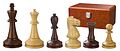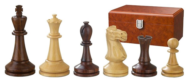 Design: Modern Staunton, Königshöhe 100 mm. Sheesham und Buchsbaum natur, poliert, aufwendig handgeschnitzter Jaques-Springer, dreifach gewichtet, Ledersockel, in Figurenbox. Inhalt:1 Schachfigurenbox, 16 dunkle Schachfiguren, 16 helle Schachfiguren. Tipp: Bre...
