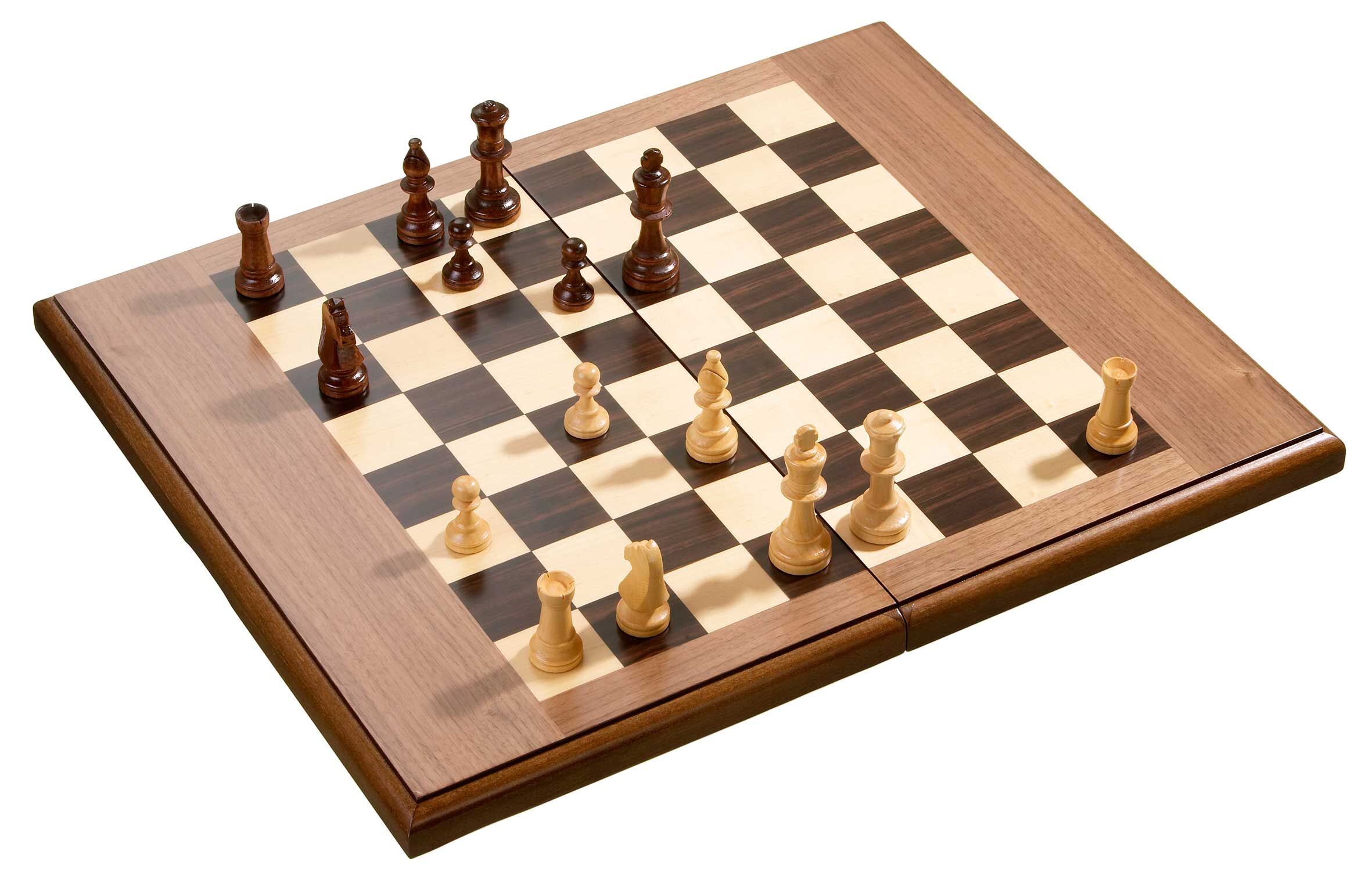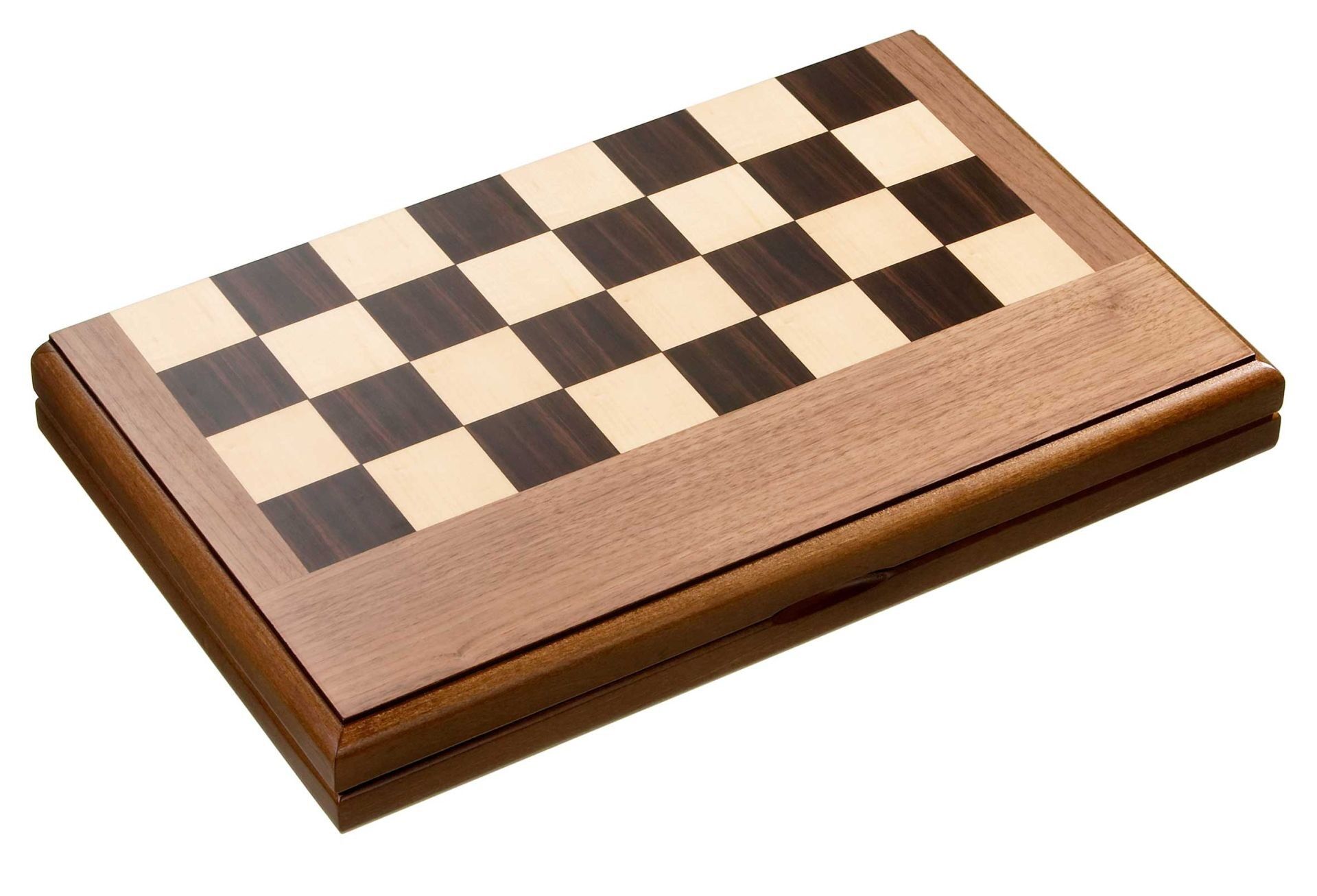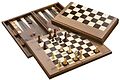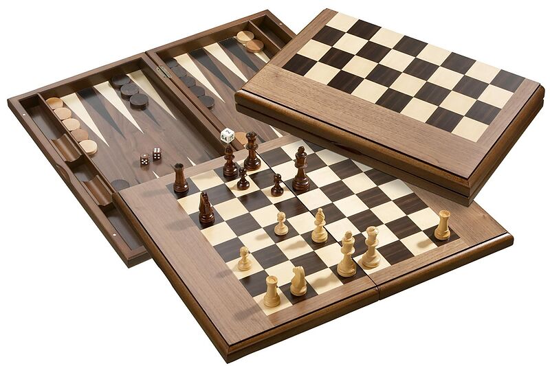 Kassette: Erle, Walnuss-, Ahorn- und Wenge-Intarsien,matt versiegelt, Maße 490 x 300 x 65 mm,Magnetverschluß. Außen: Schach und Dame, Feld 50 mm, Figuren: Design Staunton, Ahorn, natur und nussbaum gebeizt, gewichtet, Filzsockel, König 90 mm Innen: Backgammon,...