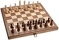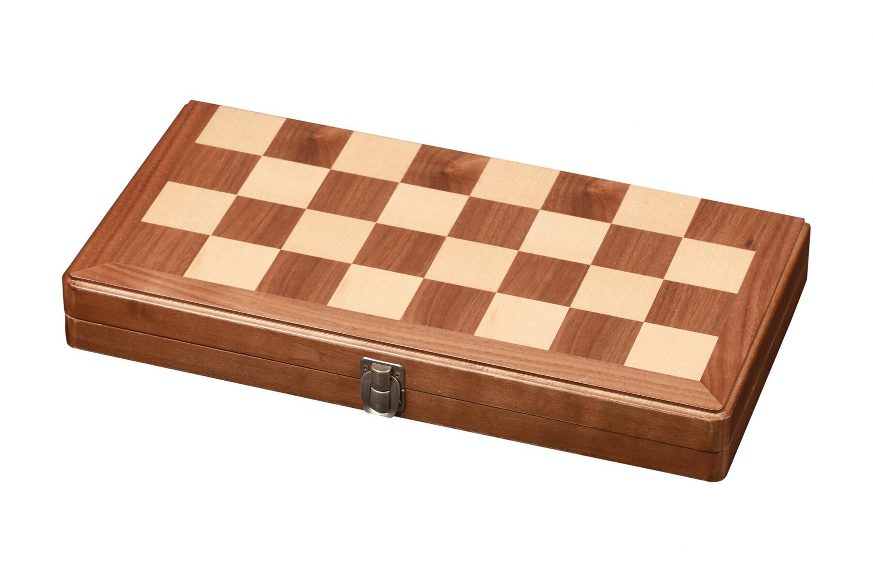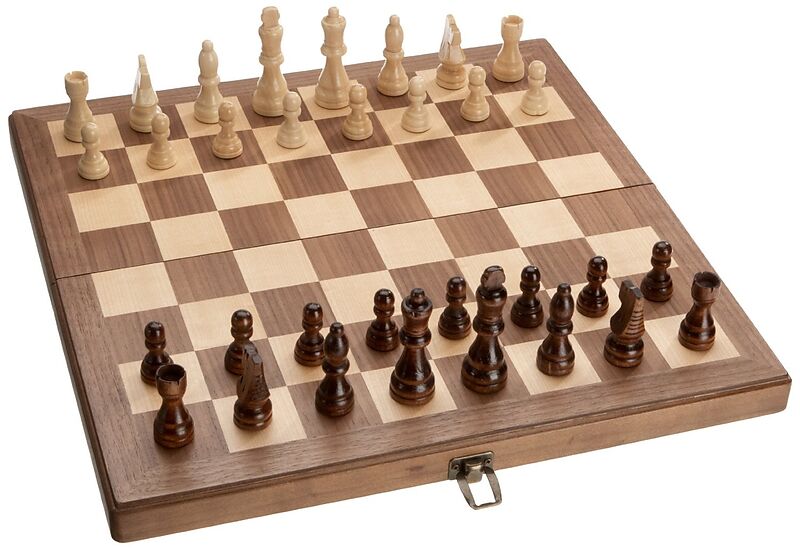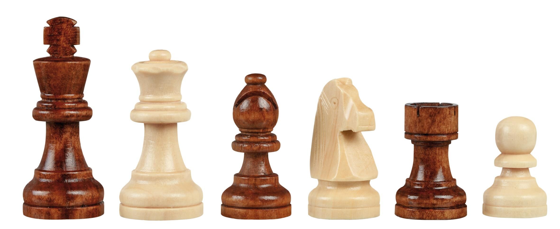 Figuren: Design Staunton, Schima-Holz, natur und braun gebeizt, Filzsockel, König 80 mm, Kassette: Walnuss und Ahorn, Intarsien, matt versiegelt. Maße 380 x 205 x 55 mm, Feldgröße 42 mm.