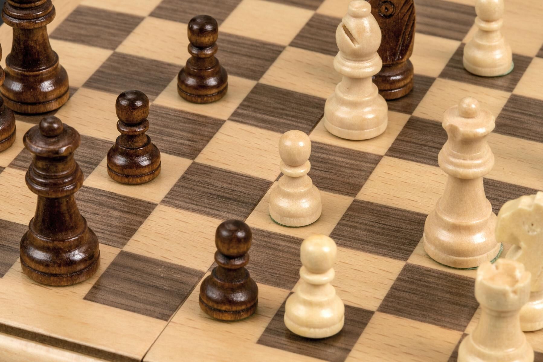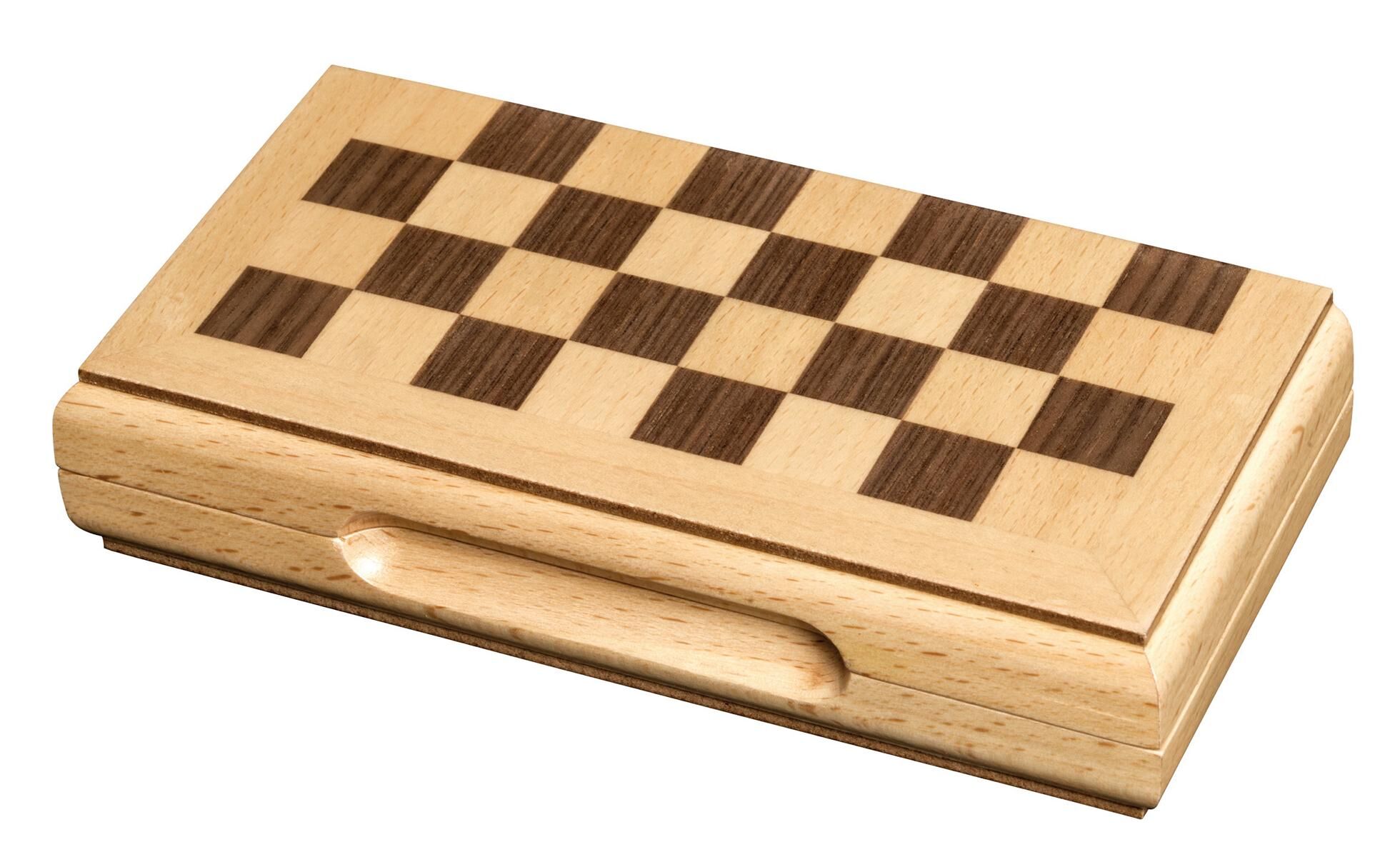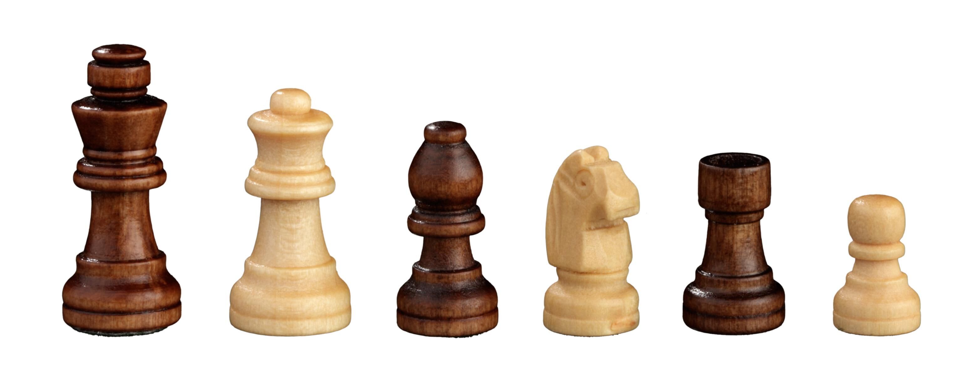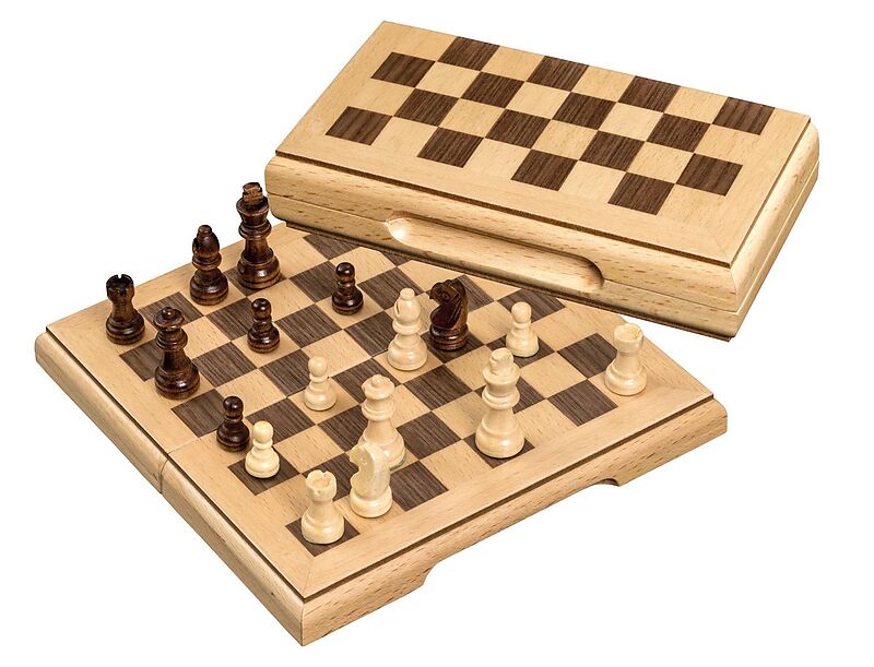 Schachkassette, Reise, Feld 17 mm, magnetisch. Figuren: Design Staunton, Ahorn, natur und braun gebeizt, gewichtet, magnetisch, Filzsockel, König 30 mm. Kassette: Buche und Walnuss, Intarsien, matt versiegelt. Maße Spiel: 170 x 85 x 38 mm Maße Spiel offen: 170...