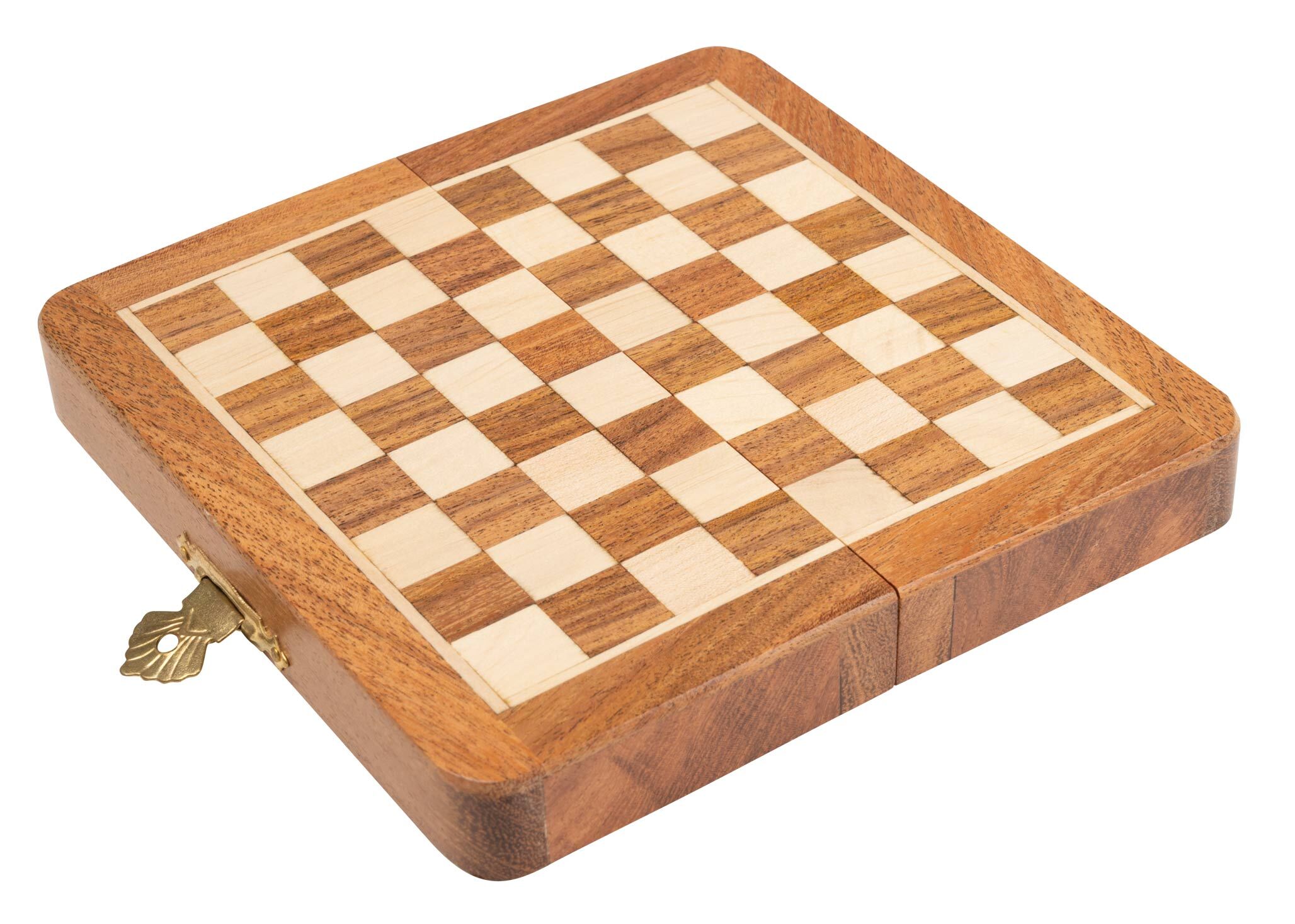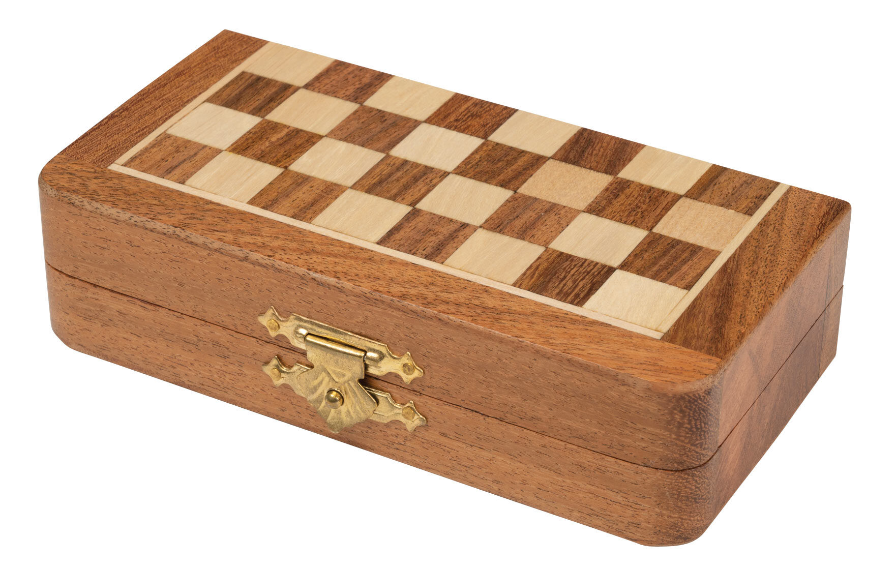 Figuren: Design Staunton, Sheesham und Buchsbaum,König 20 mm. Kassette: Sheesham und Ahorn, Intarsien, Zierader Maße 130 x 65 x 35 mm, Feldgröße 12 mm.