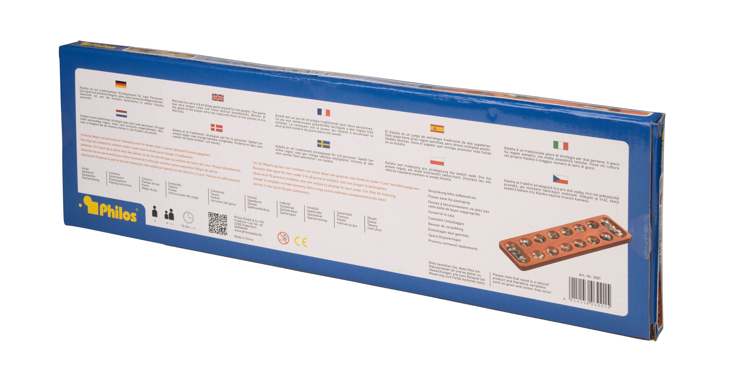 Kalaha ist ein traditionelles Strategiespiel für zwei Personen. Das Spiel hat einfache Regeln, aber viele taktische Möglichkeiten. Gewinner ist, wer die meisten Spielsteine in seiner Kalaha sammelt. Maße: 440 x 130 x 20 mm Material: Hevea Holz, rotbraun gebeiz...
