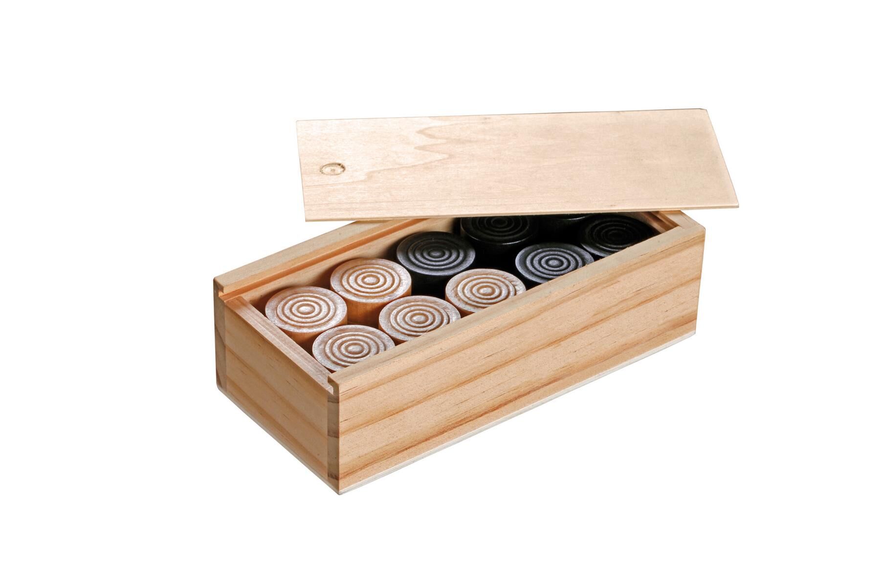 Spielsteine für Dame und Mühle. Inhalt: 20 dunkle Spielsteine, 20 helle Spielsteine in Holzbox Material: Birke, Kiefer Maße Verpackung: 170 x 80 x 50 mm