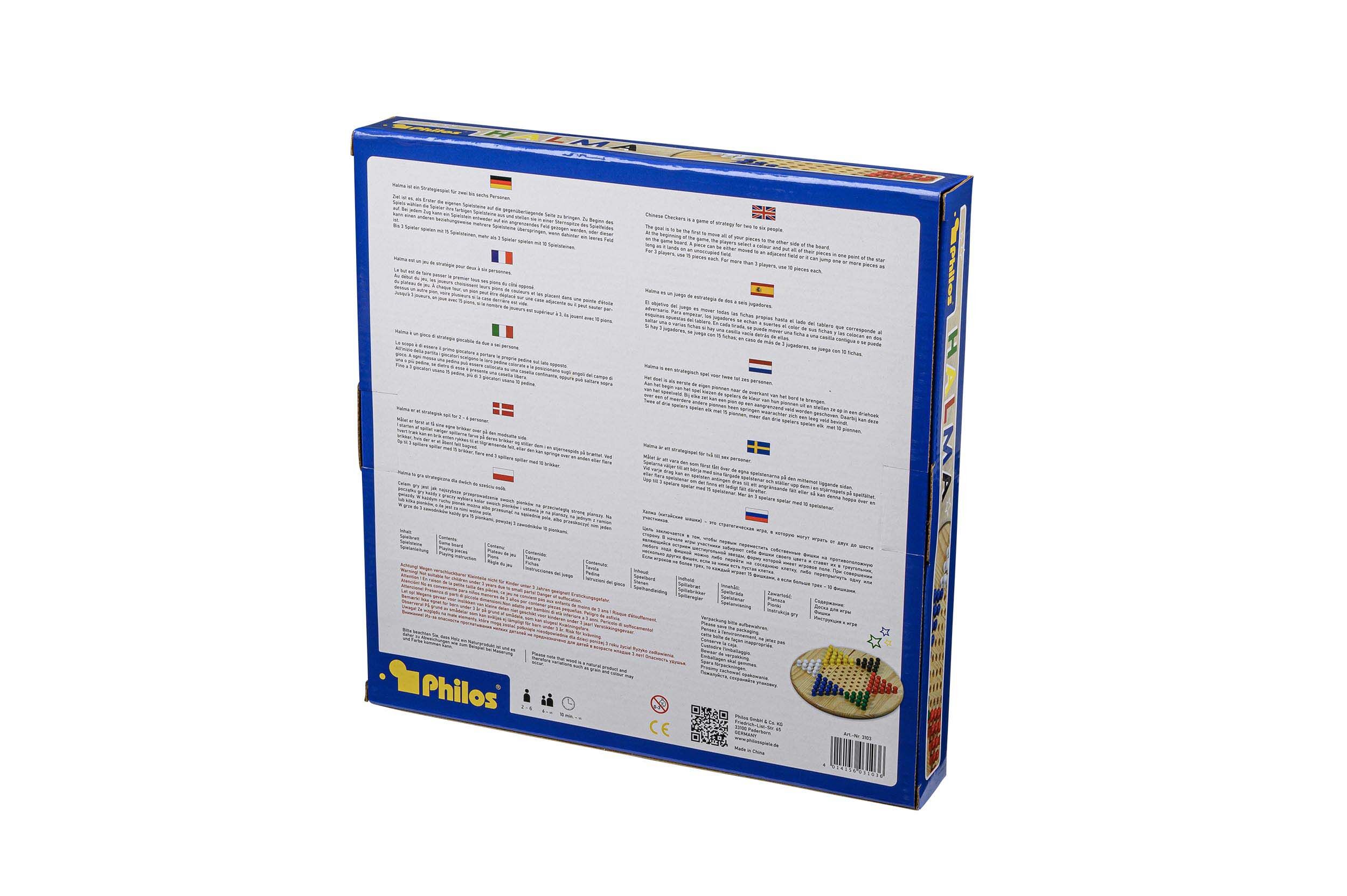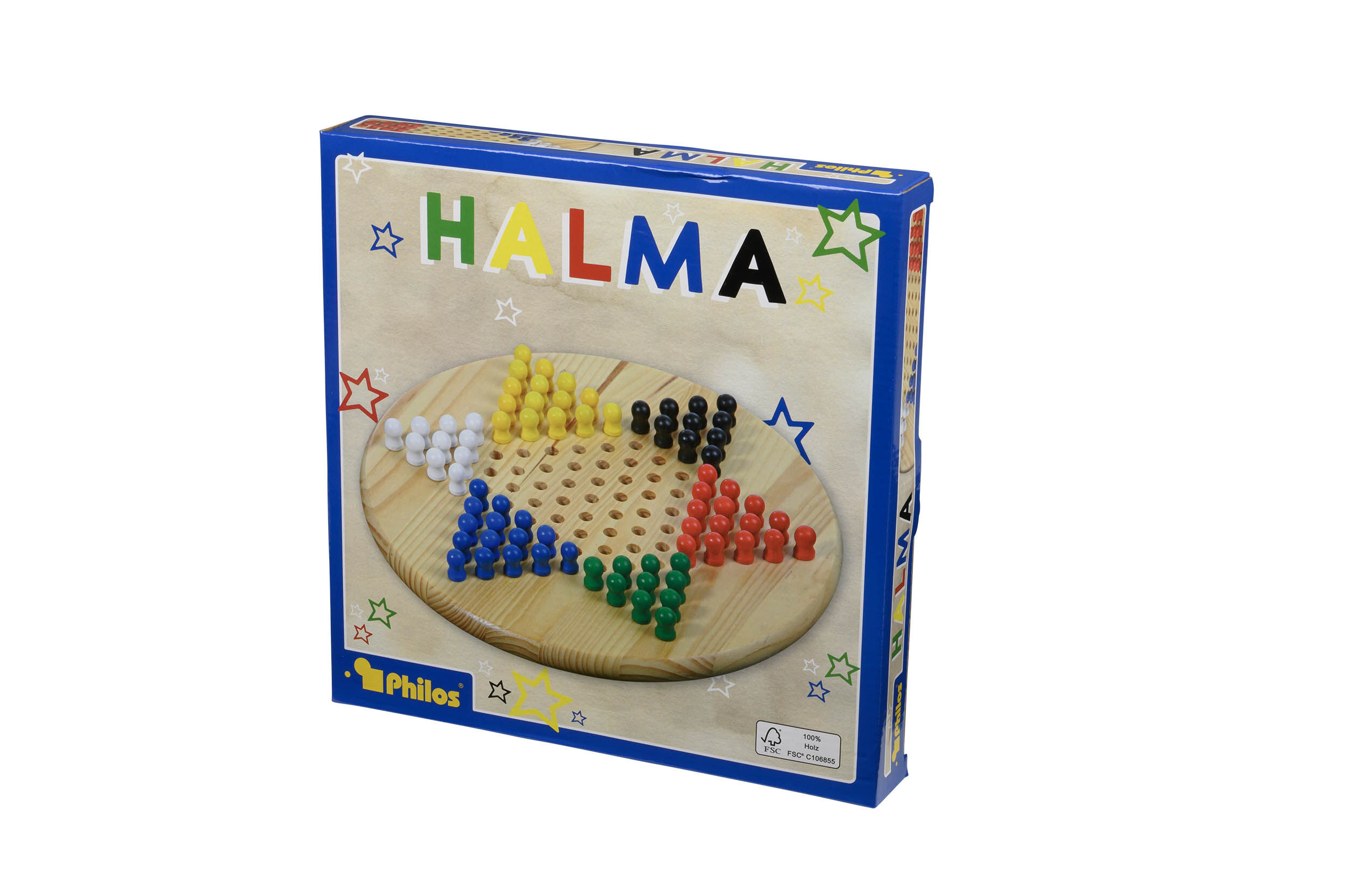 Halma ist ein Strategiespiel für 2 bis 6 Spieler. Ziel ist es, als Erster die eigenen Spielsteine auf die gegenüberliegende Seite zu bringen. Zu Beginn des Spiels wählen die Spieler ihre farbigen Spielsteine aus und stellen sie in einer Sternspitze des Spielfe...