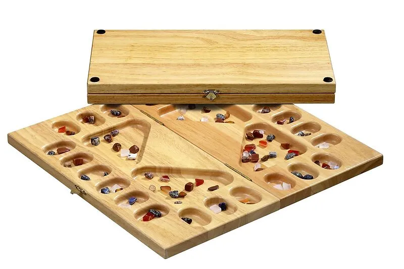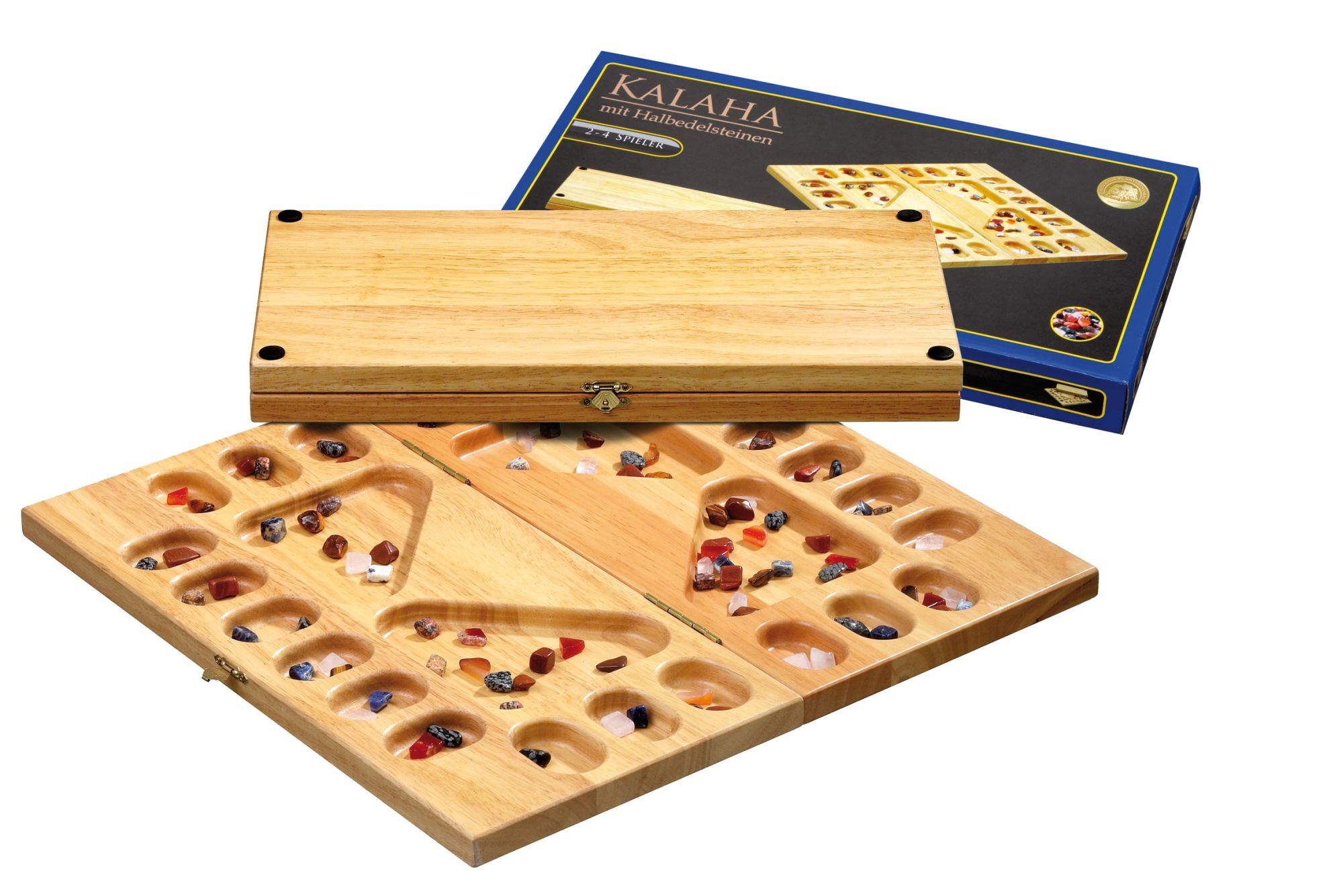 Hevea-Holz, Maße 410 x 210 x 40 mm, mit verschiedenen Halbedelsteinen. Strategiespiel für 2-4 Personen.