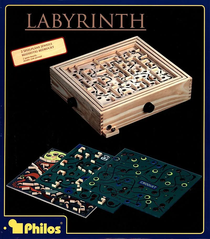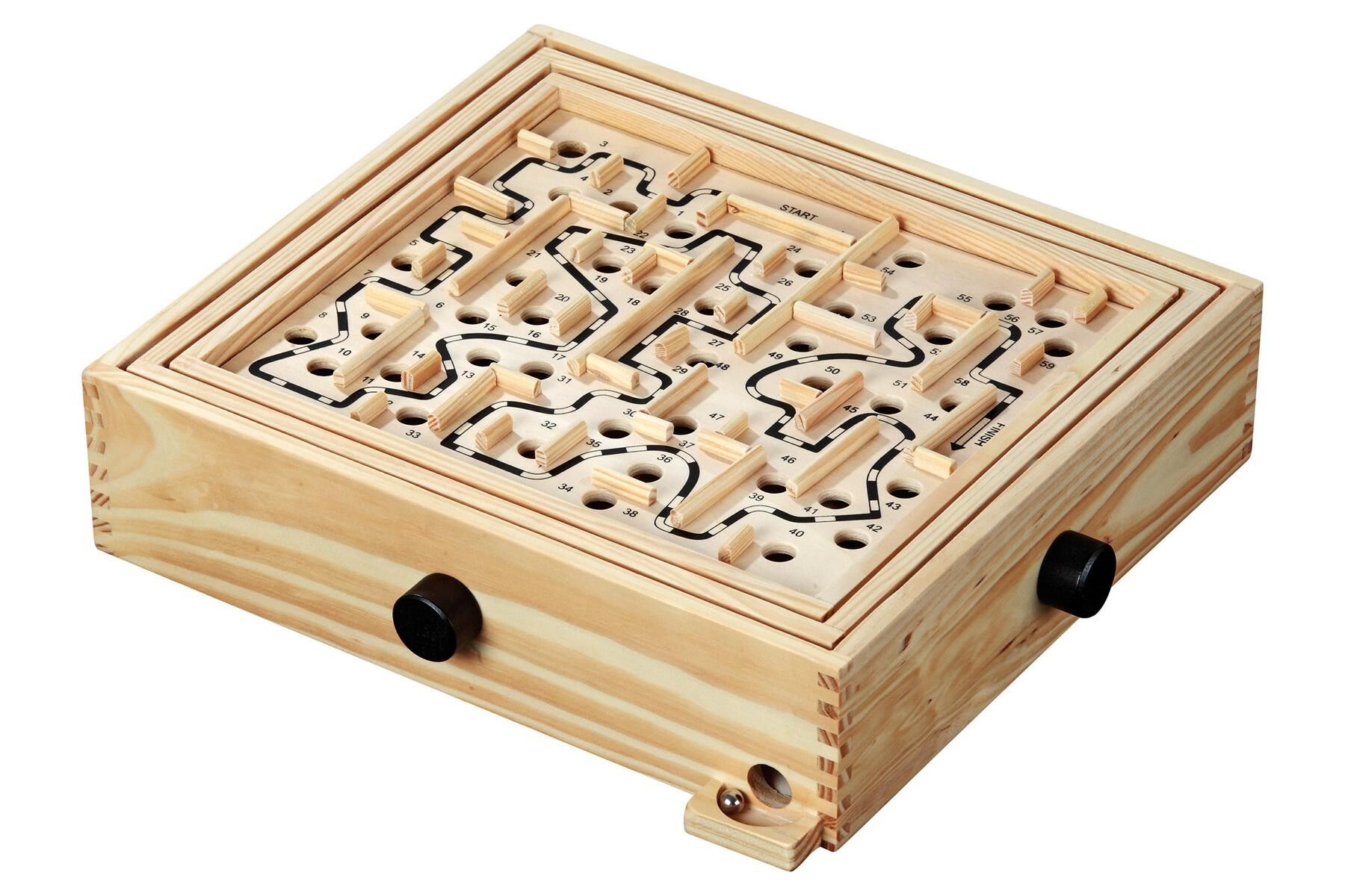 Labyrinth aus Kiefernholz. In diesem faszinierenden Spiel geht es um Geschicklichkeit, Geduld und Können. Eine kleine Eisenkugel muss einen vorgegebenen Weg durchlaufen, der mit einer Vielzahl von Bohrungen durchsetzt ist. Nur wer mit großem Fingerspitzengefüh...