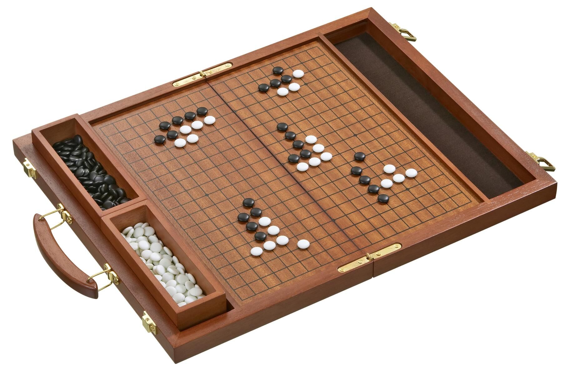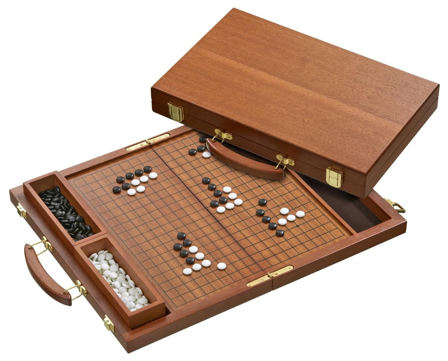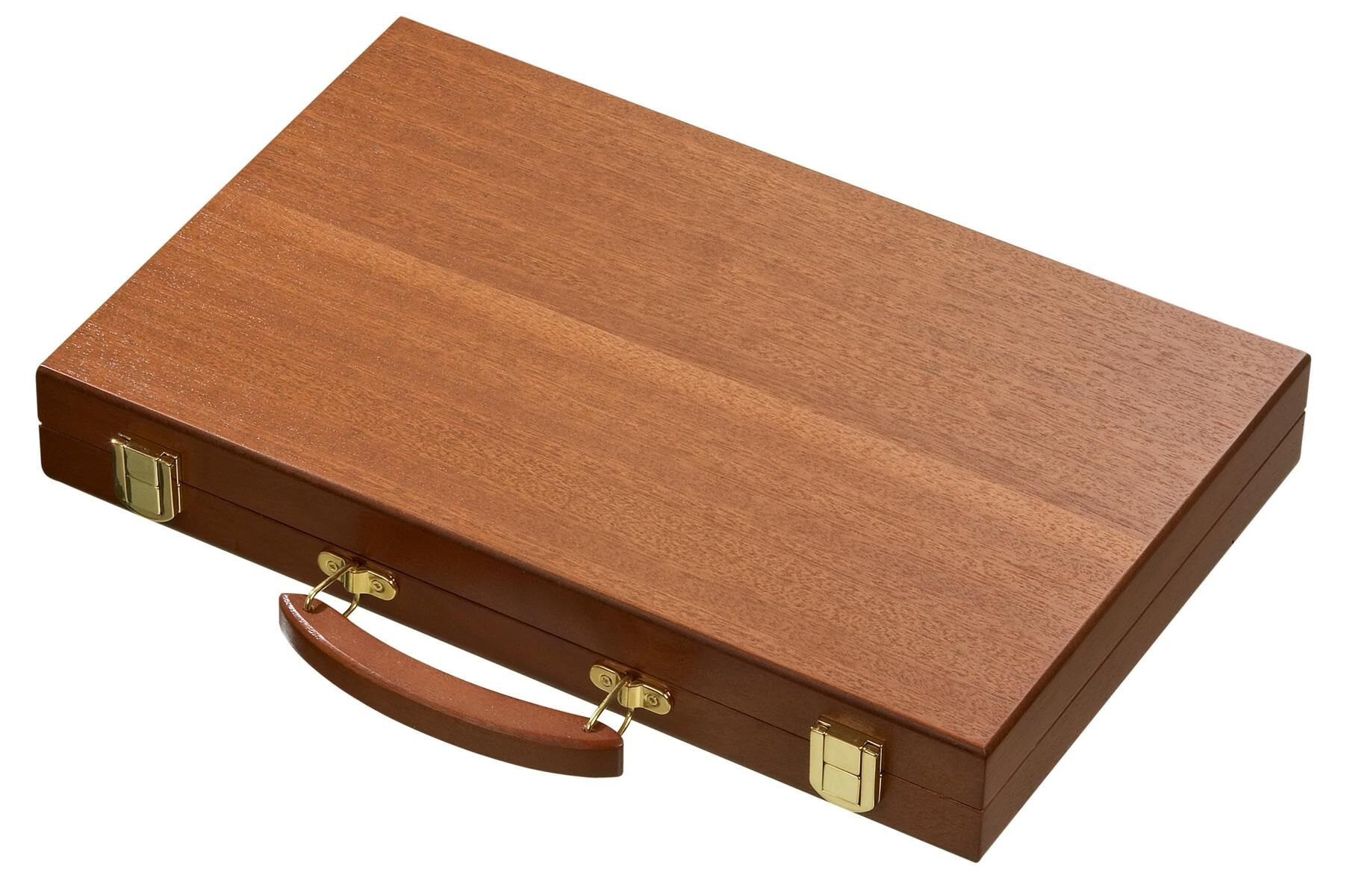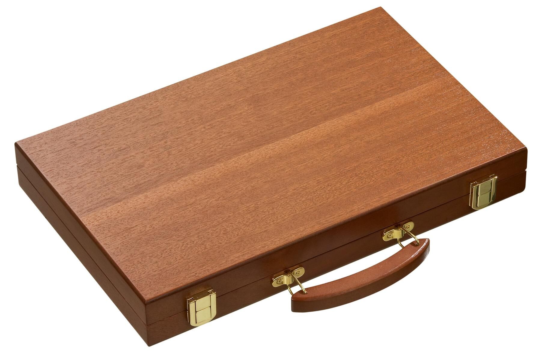 Koffer: Mahagoni, Maße 370 x 235 x 50 mm,Feldgröße 17 x 15 mm.Spielsteine: Urea, Durchmesser 13 mm, je 180 Stück,in 2 Spielsteinboxen aus Mahagoni.