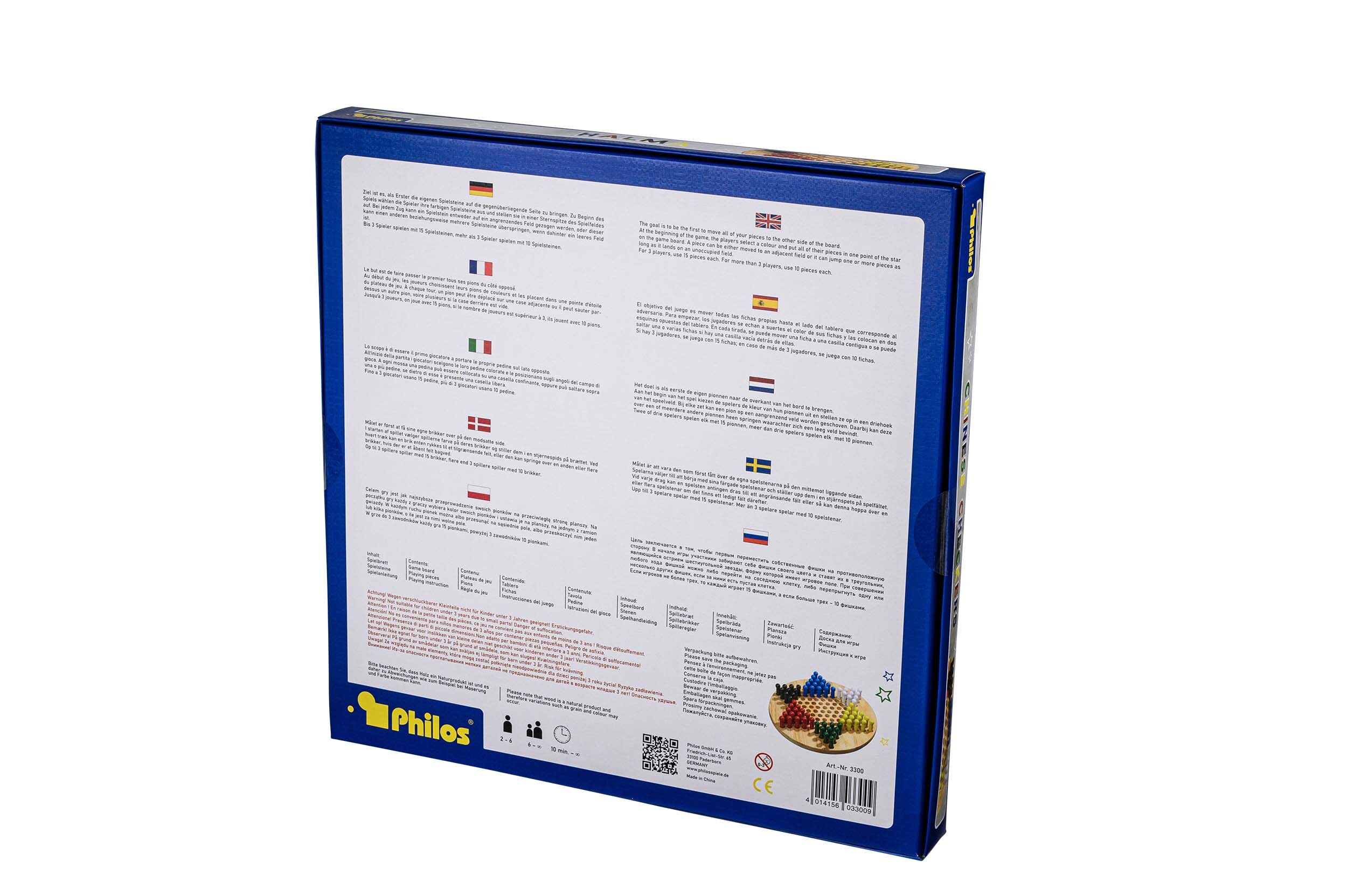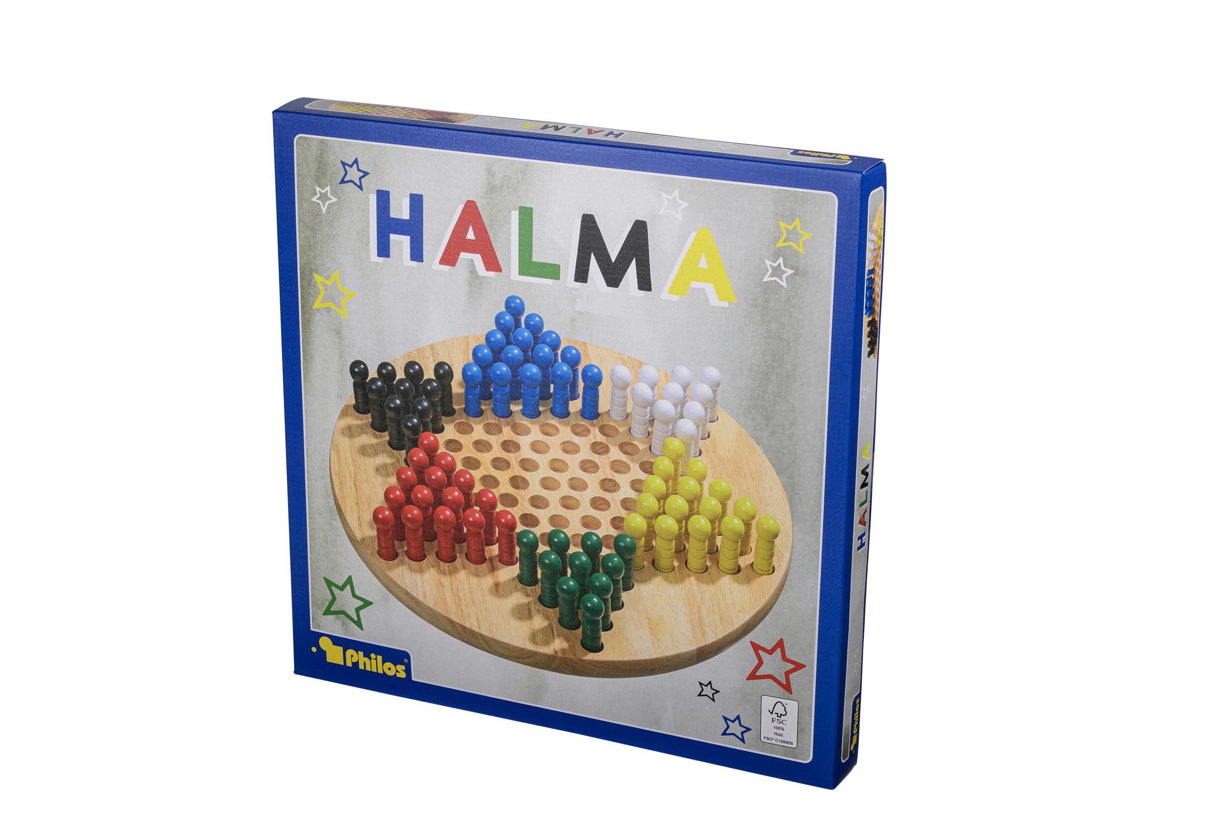 Halma ist ein Strategiespiel für 2 bis 6 Personen. Ziel ist es, als Erster die eigenen Spielsteine auf die gegenüberliegende Seite zu bringen. Zu Beginn des Spiels wählen die Spieler ihre farbigen Spielsteine aus und stellen sie in einer Sternspitze des Spielf...