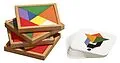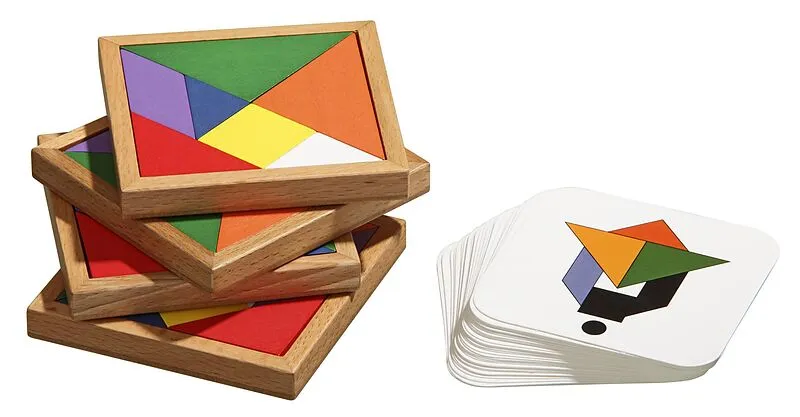 Ziel des Spiels ist es, als Erster die auf einer Aufgabenkarte abgebildete Figur mit seinem Tangram-Set zu legen. Für jede Figur werden immer alle Puzzleteile eines Sets benötigt. Buche und Hevea-Holz gefärbt, Maß für ein Tangram-Set 100 x 100 x 13 mm, 4 Sets ...