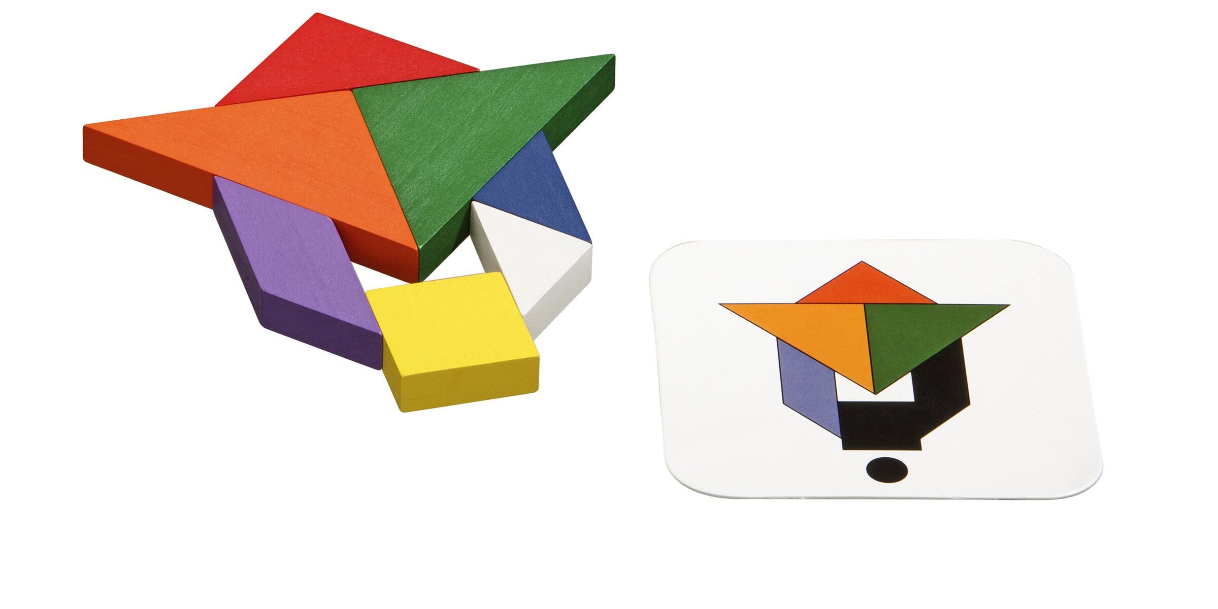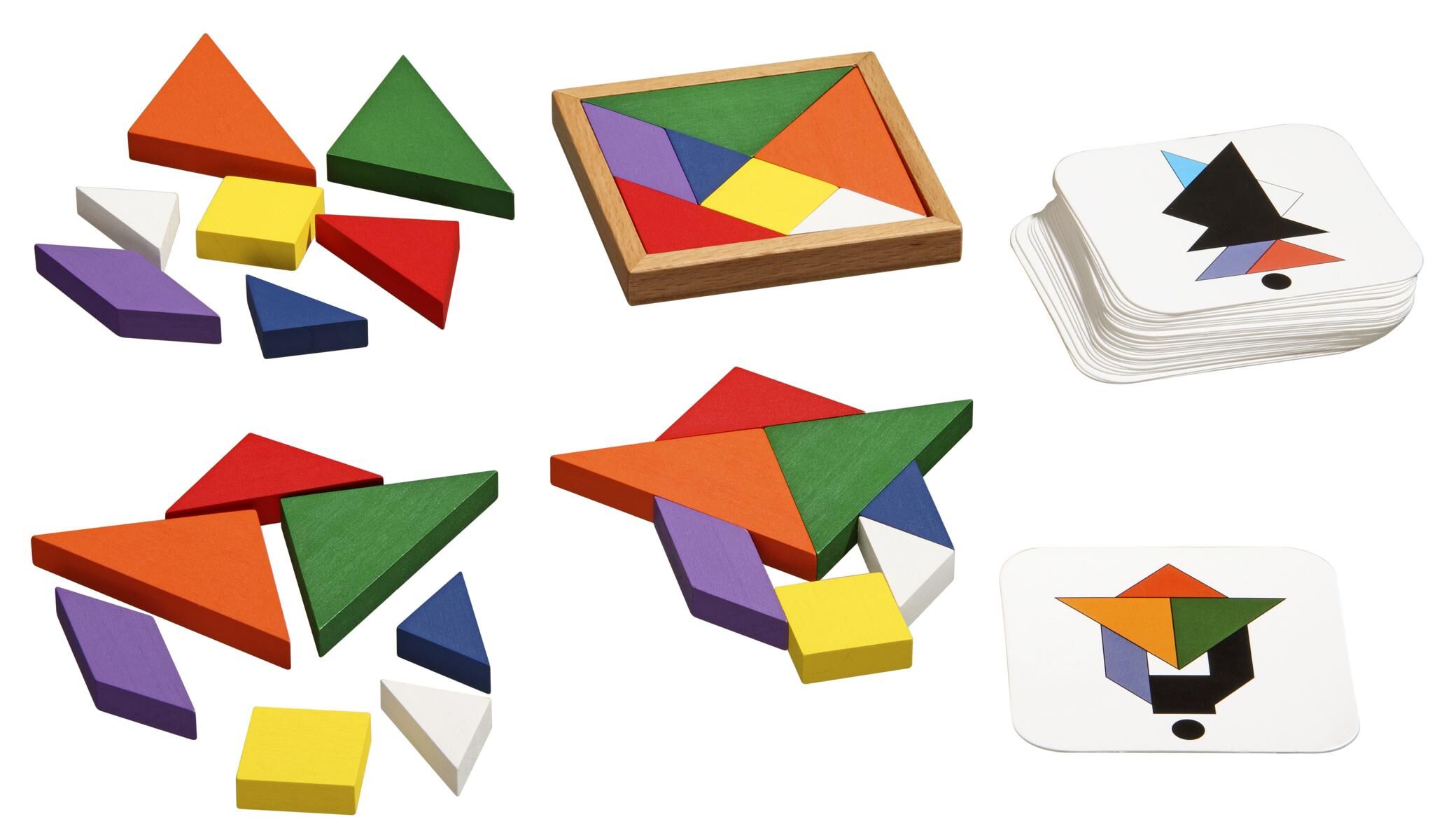 Ziel des Spiels ist es, als Erster die auf einer Aufgabenkarte abgebildete Figur mit seinem Tangram-Set zu legen. Für jede Figur werden immer alle Puzzleteile eines Sets benötigt. Buche und Hevea-Holz gefärbt, Maß für ein Tangram-Set 100 x 100 x 13 mm, 4 Sets ...
