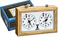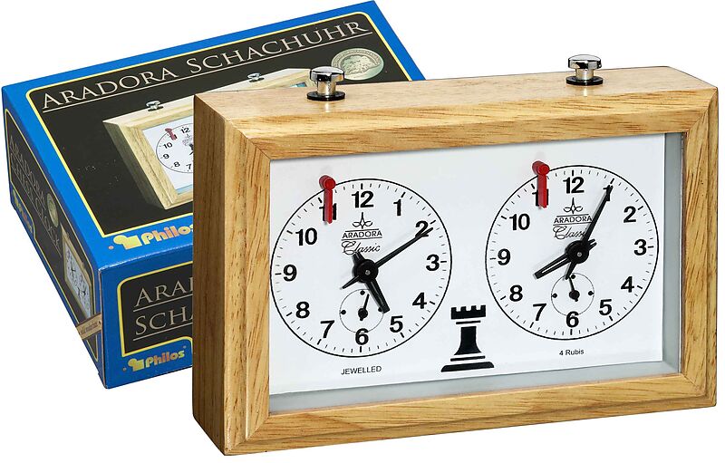 Zwei nebeneinander liegende Uhrwerke, die durch einen Kippmechanismus im Inneren abwechselnd in Bewegung gesetzt werden. Jedes Uhrwerk ist mit einem roten Kippschalter für die letzten 5 Minuten eines Spiels ausgestattet. Maße Uhr: 185 x 125 x 55 mm; Material:B...