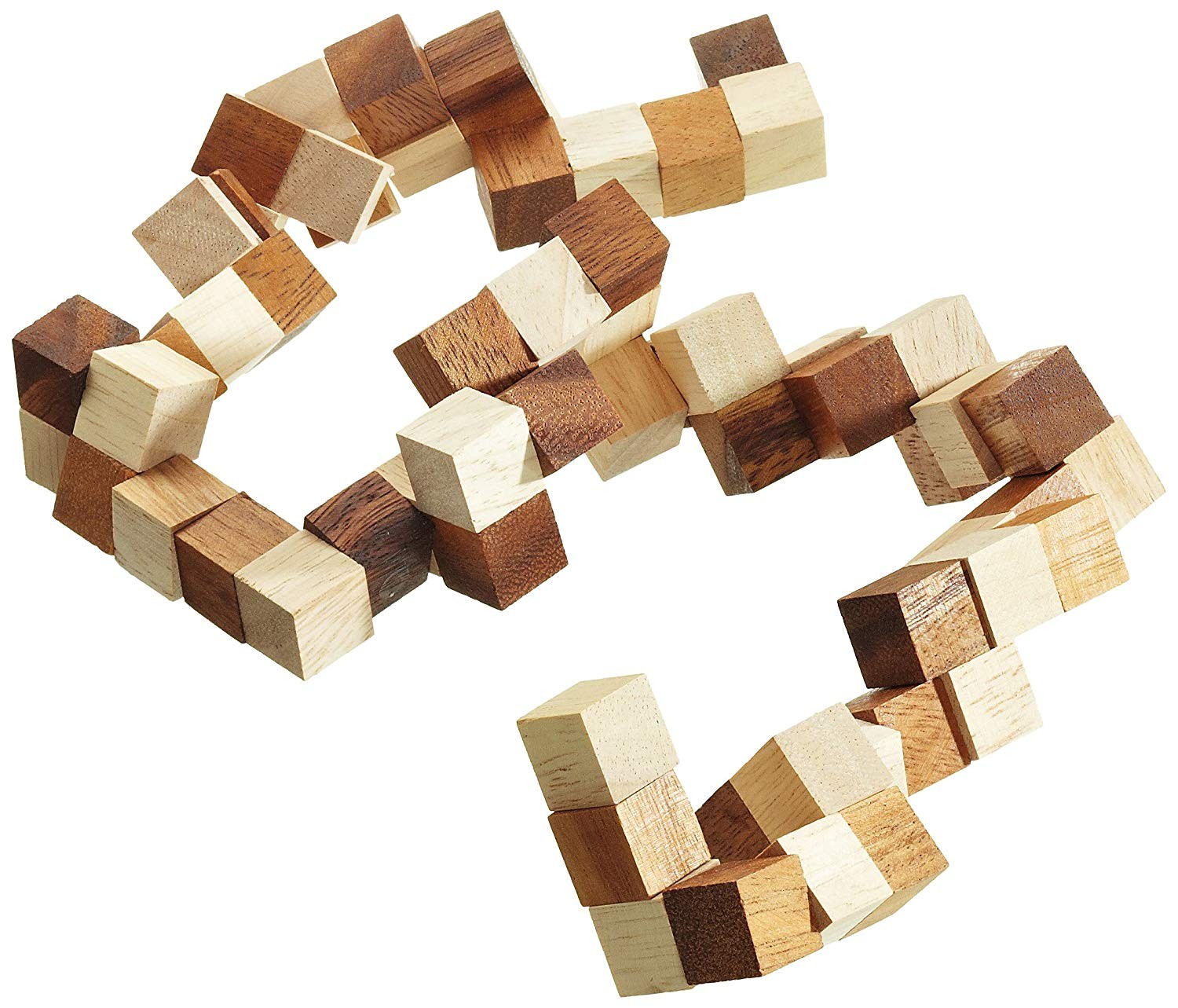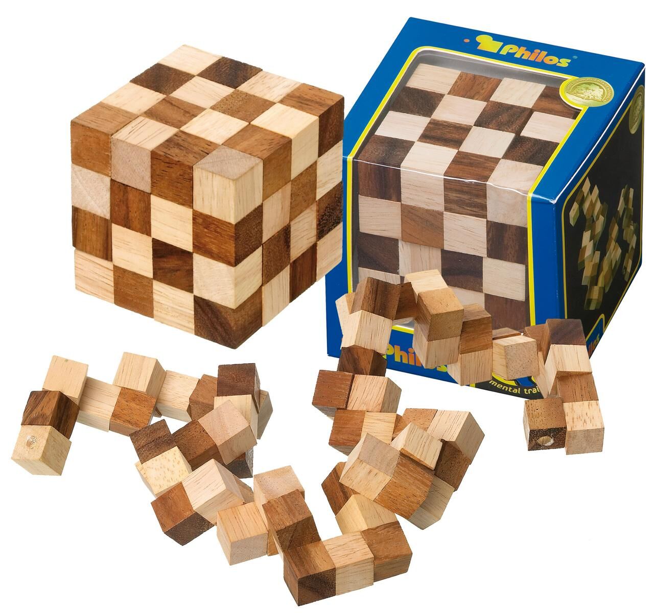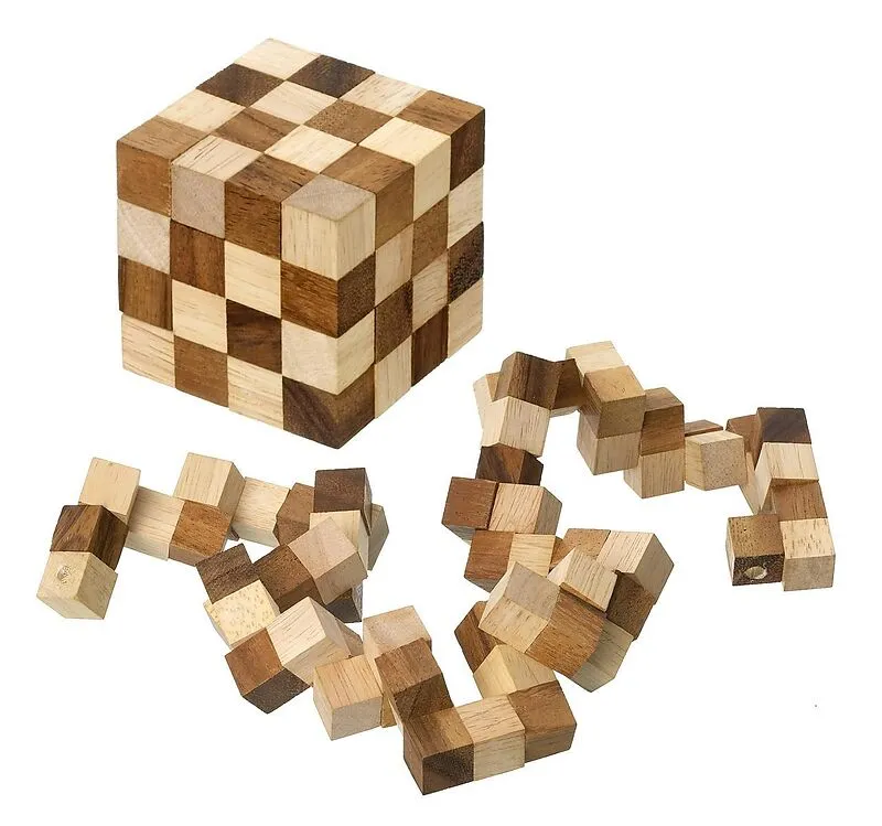 Alle Bausteine dieses Würfels sind mit einer Schnur verbunden. Ist der Würfel auseinander gezogen (Schlange), erfordert es viel Geschick und Geduld, dem Würfel seine ursprüngliche Gestalt wieder zugeben.