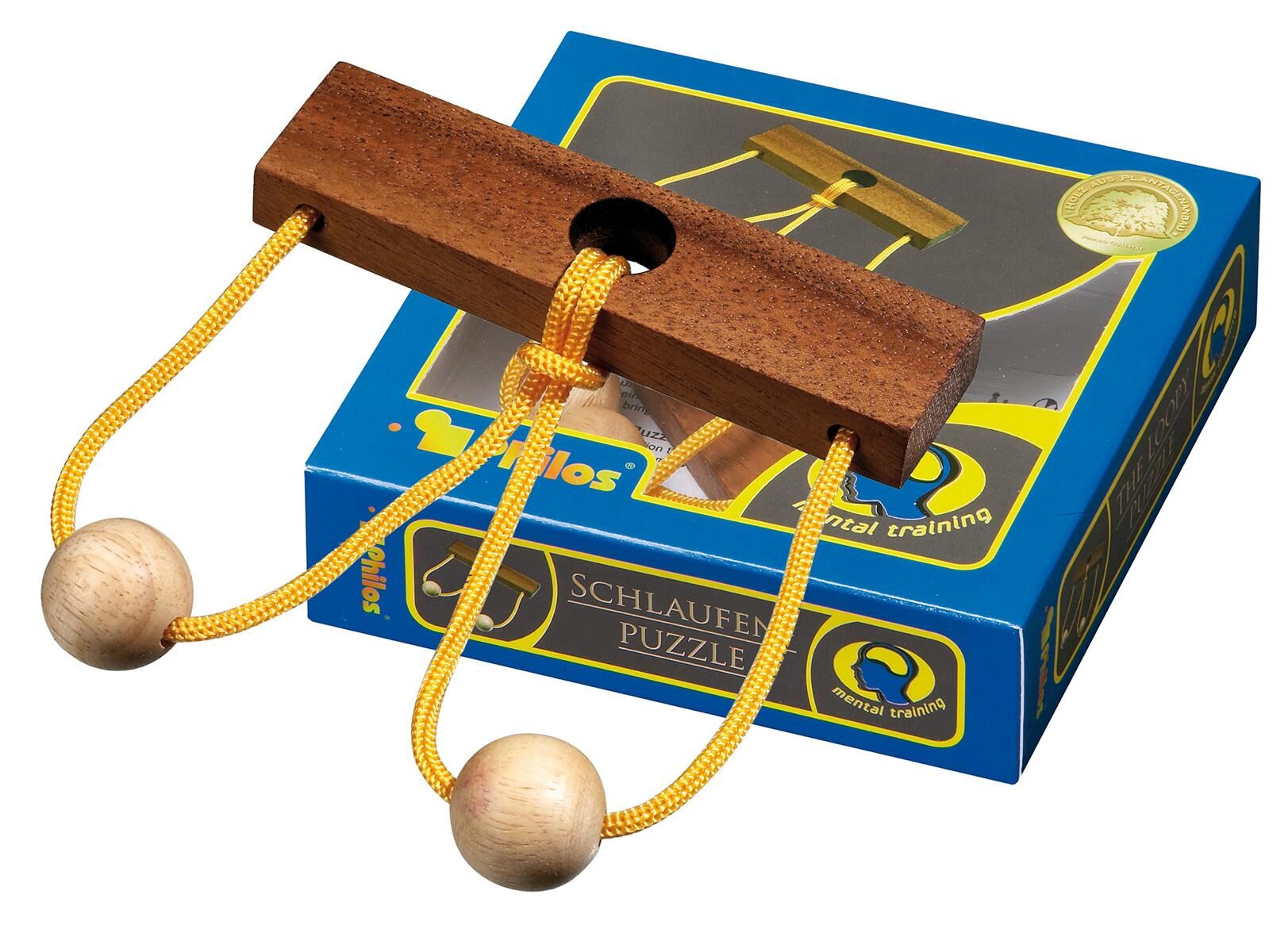 Samena-Holz, auch im Display lieferbar. In der Ausgangsposition befindet sich in jeder der beiden herabhängenden Schlaufen eine Kugel. Ziel des Spiels ist es, beide Kugeln in eine gemeinsame Schlaufe zu bringen.