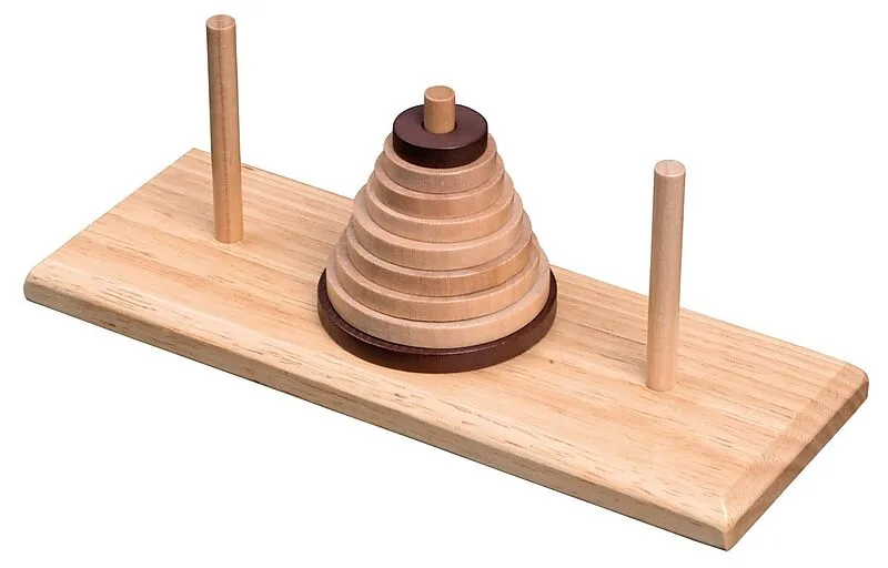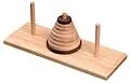 Das Ziel des Kombinationsspiels Turm von Hanoi ist es, die neun Scheiben von der mittleren Position auf eine Seite umzulagern. Dabei darf stets nur eine Scheibe pro Zug umgesetzt werden und es darf nie eine größere Scheibe auf eine kleinere Scheibe gelegt werd...