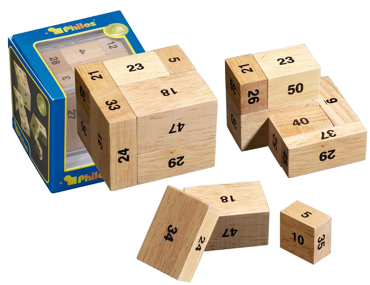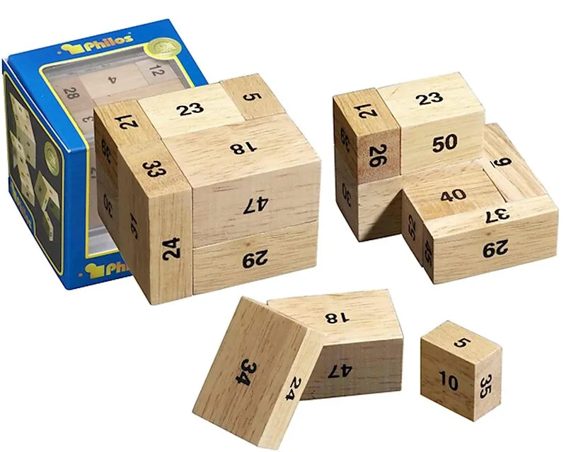 Hevea-Holz, Maße 68 x 62 x 56 mm, 9 Puzzleteile 9 verschiedene große Holzquader, die mit den Zahlen 1 bis 54 beschriftet sind, sollen so zu einem großen Quader zusammengesetzt werden, dass die Summe der Zahlen auf jeder der sechs großen Quaderseiten immer 100 ...