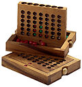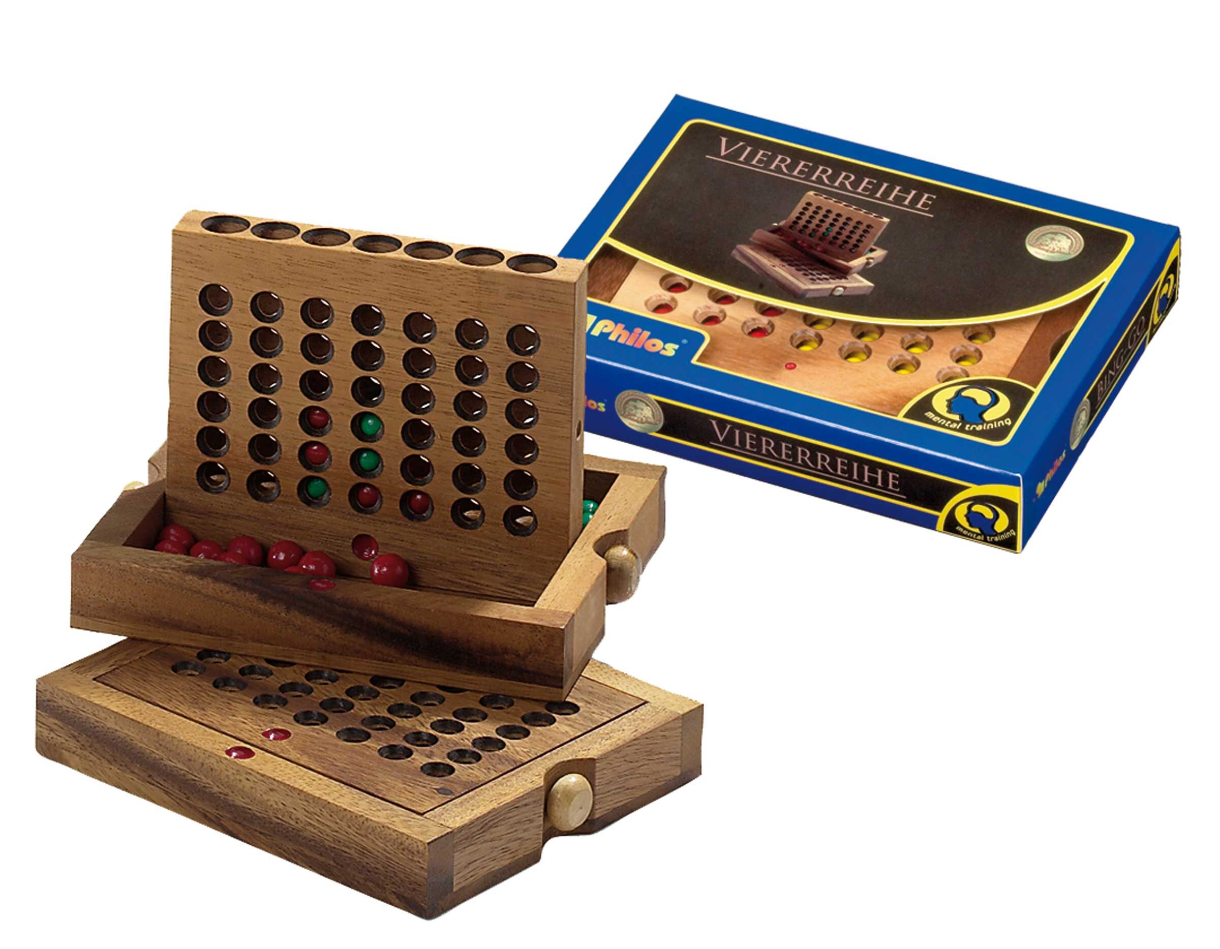 Samena-Holz, Maße 195 x 160 x 37 mm,Philos-Verpackung.Ein Strategiespiel für zwei Personen, bei dem die erste Viererreihe einer Farbe siegt.