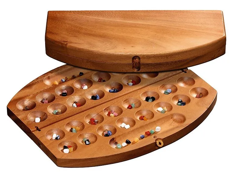 Klappkassette, Samena-Holz, Maße 300 x 250 x 20 mm,anspruchsvolle Kalaha-Variante, mit bunten Natursteinen. Strategiespiel für 2 Personen.