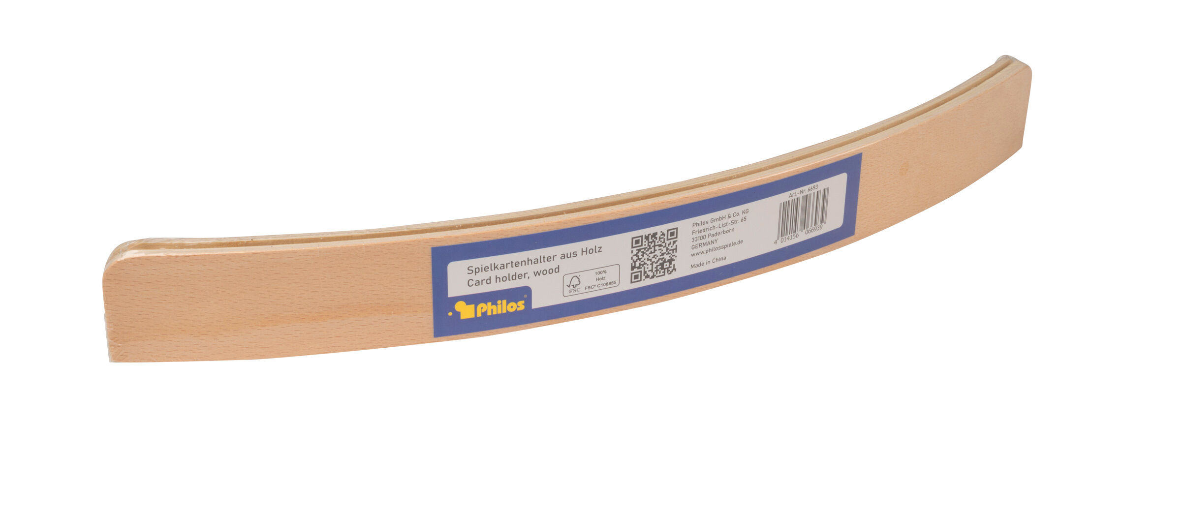 Spielkartenhalter aus Holz, Bogenmaß: 335mm; Maße 350 x 35 x 10 mm; Material: Sperrholz; Farbe: hellbraunInhalt: 1 Spielkartenhalter, ohne Spielkarten