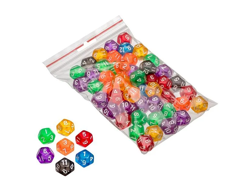 Würfel, 12-seitig - Kantenlänge 17 mm, Kunststoff, transparent, 50er Beutel, bunt gemischt