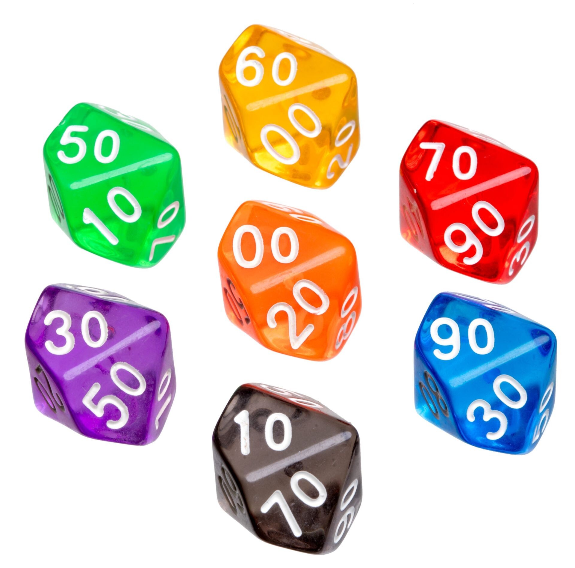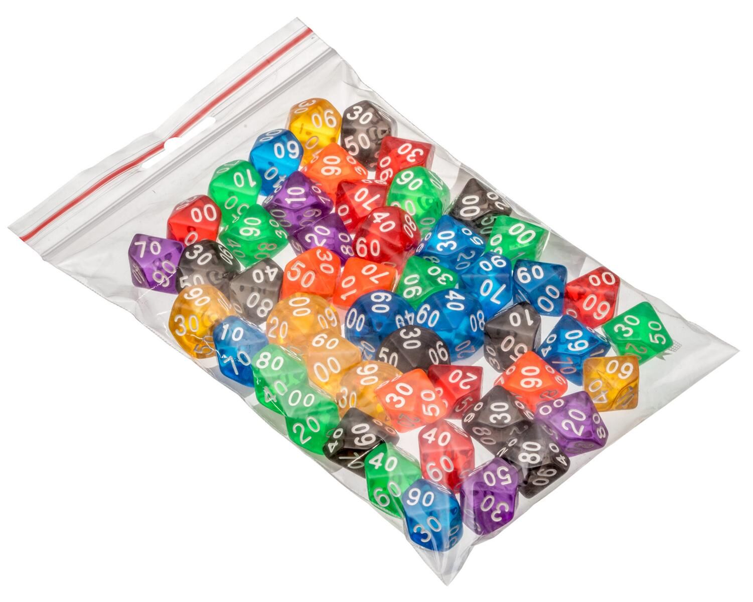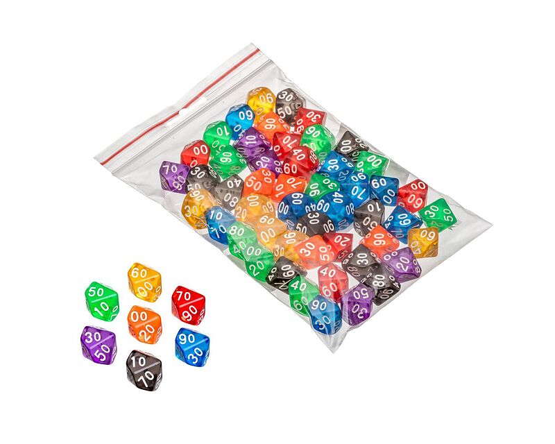 Würfel 100er, 10-seitig - Kantenlänge 22 mm, Kunststoff, transparent, 50er Beutel, bunt gemischt