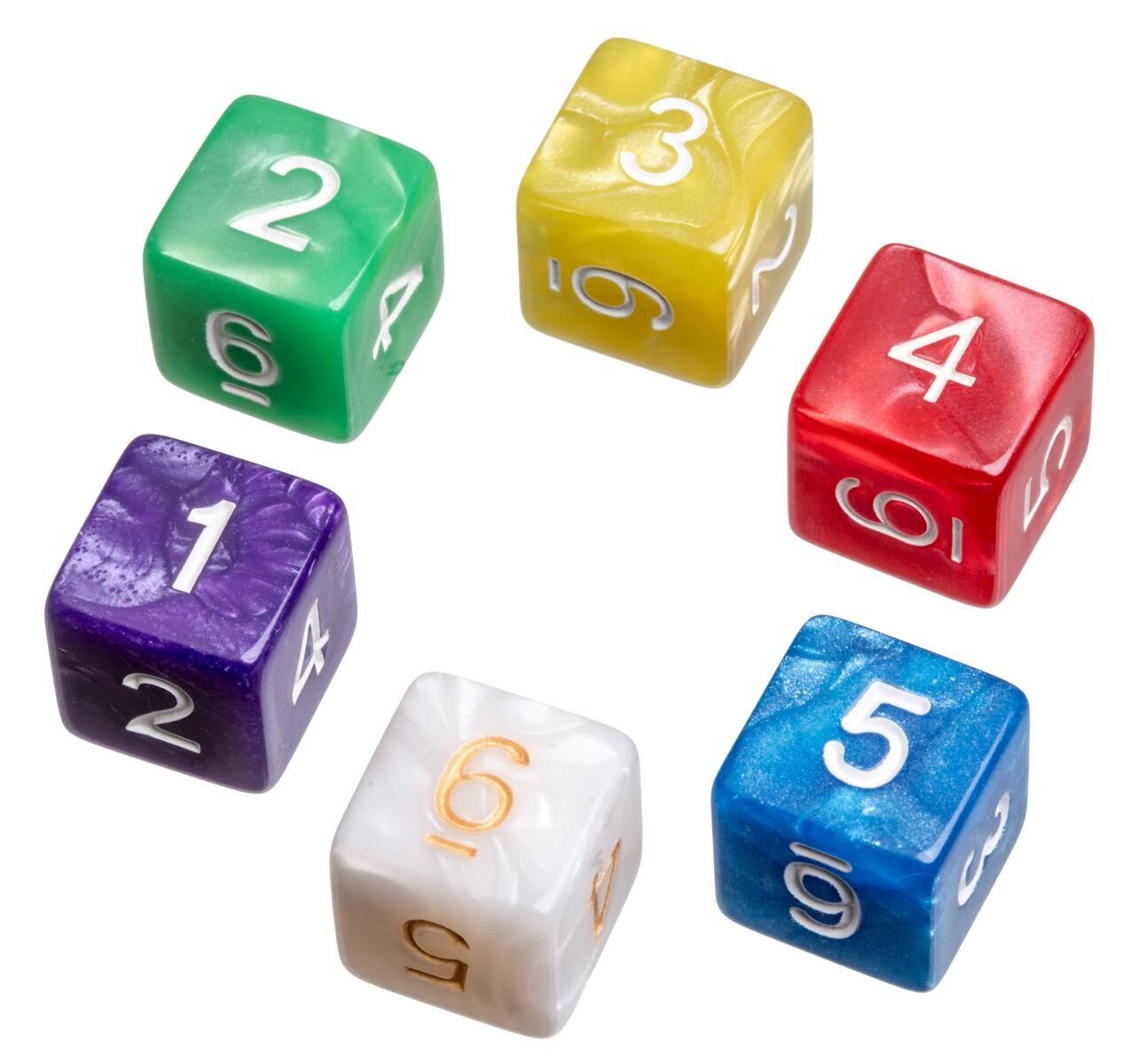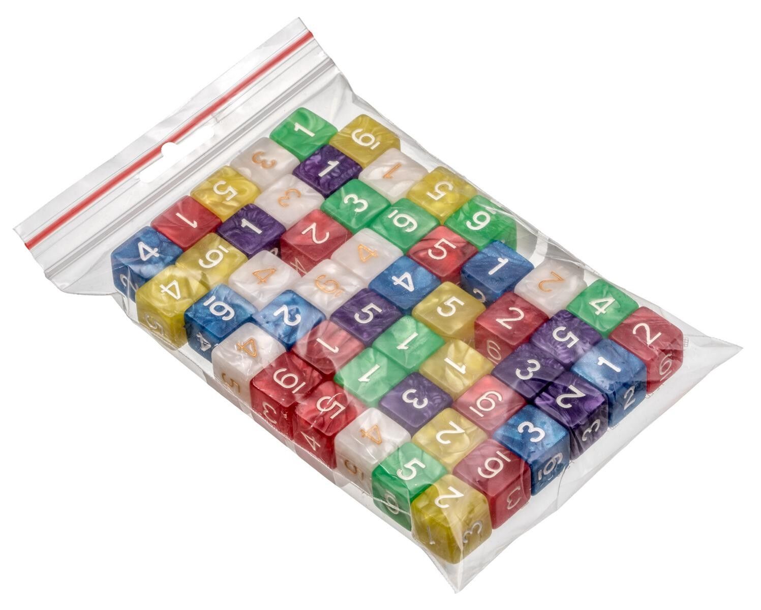 Maße Würfel: 16 x 16 x 16 mm, 6-seitigMaterial: KunststoffInhalt: 50 Stück, in einem Polybeutel verpacktFarbe: pearl, bunt gemischtMaße Verpackung: 170 x 120 x 30 mm