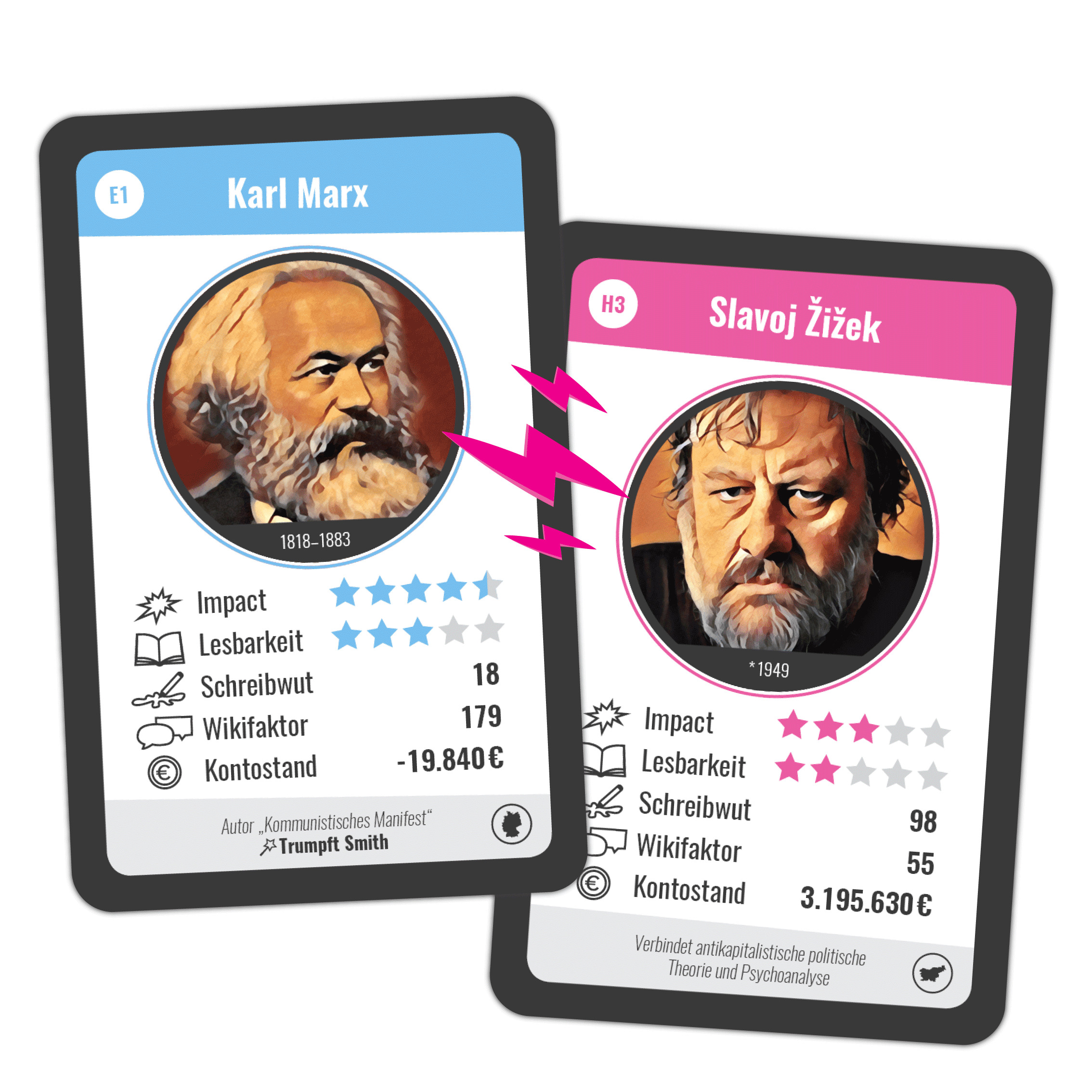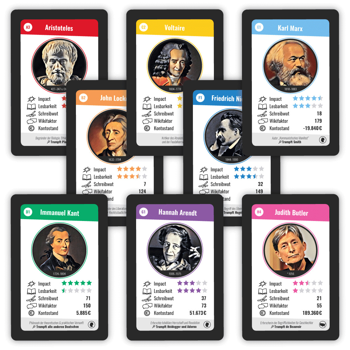 Marx schlägt Smith, Arendt killt Heidegger wer schon immer mal wissen wollte, welche Philosophen ihre Kollegen intellektuell, moralisch oder finanziell in die Tasche stecken, muss einfach nur Karten spielen. Kartenspiel mit 32 Philosophinnen und Philosophen! L...