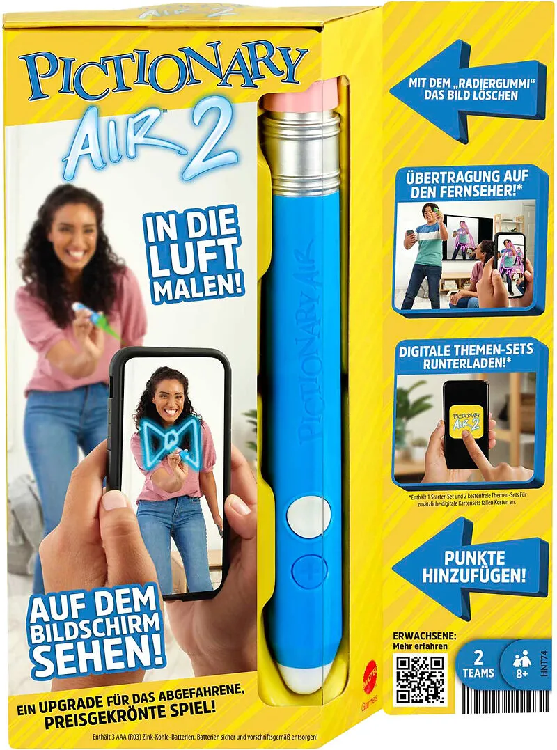 Mattel HNT74 Pictionary Air 2 Das magische Pictionary-Spielprinzip ''Zeichne in die Luft und sieh es auf dem Bildschirm'' ist jetzt noch besser. Verbessertes Erlebnis mit der Möglichkeit, mit dem Stift zu löschen und zu punkten. Zusätzliche Inhalte können über...