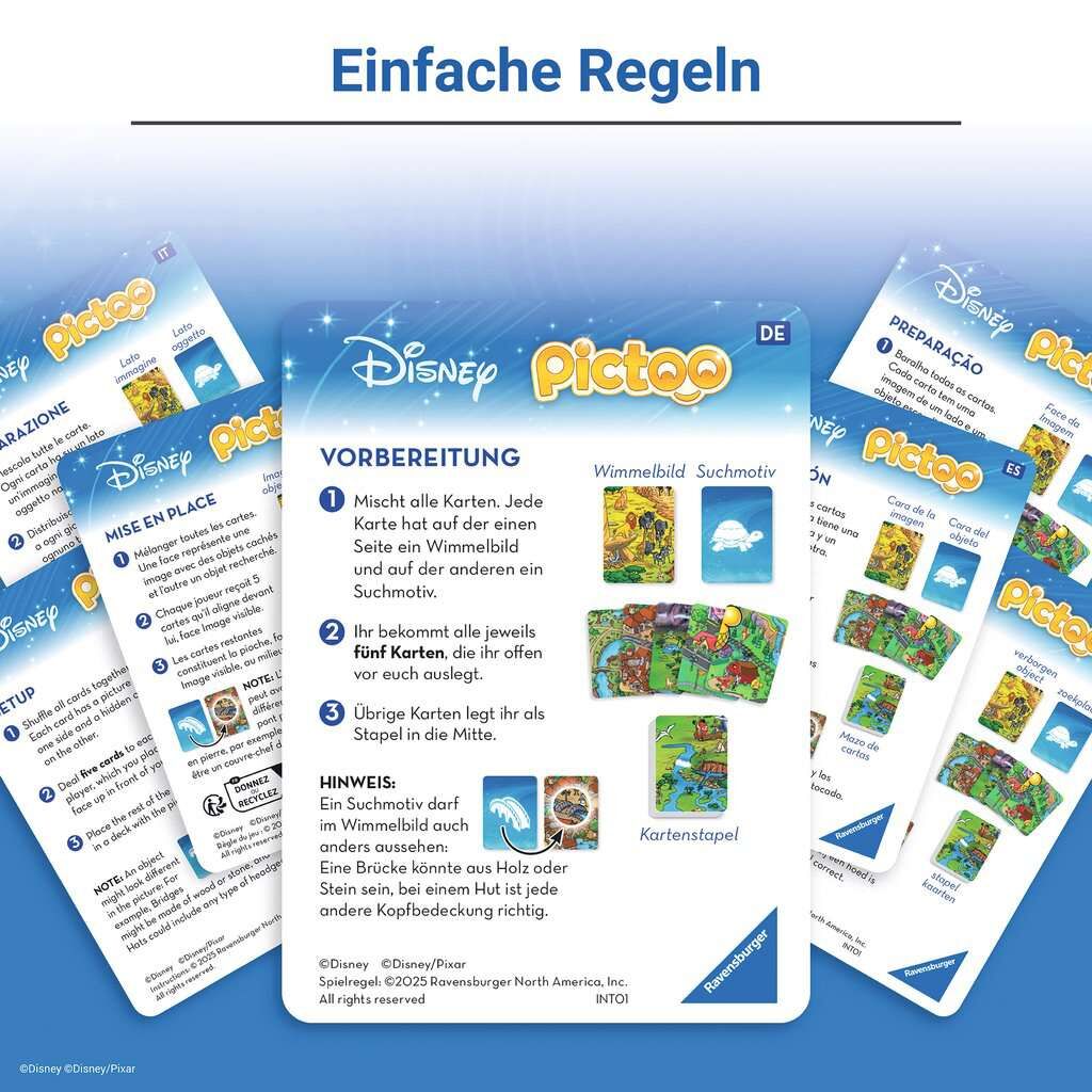 Bei diesem schnellen Kartenspiel sind auf 57 großen Wimmelbild-Karten verborgene Schätze und Figuren aus 12 Disney-Welten versteckt. Jeder erhält fünf Karten, die er offen vor sich ablegt. Die oberste Karte vom mittigen Stapel wird auf das Suchmotiv gedreht. N...