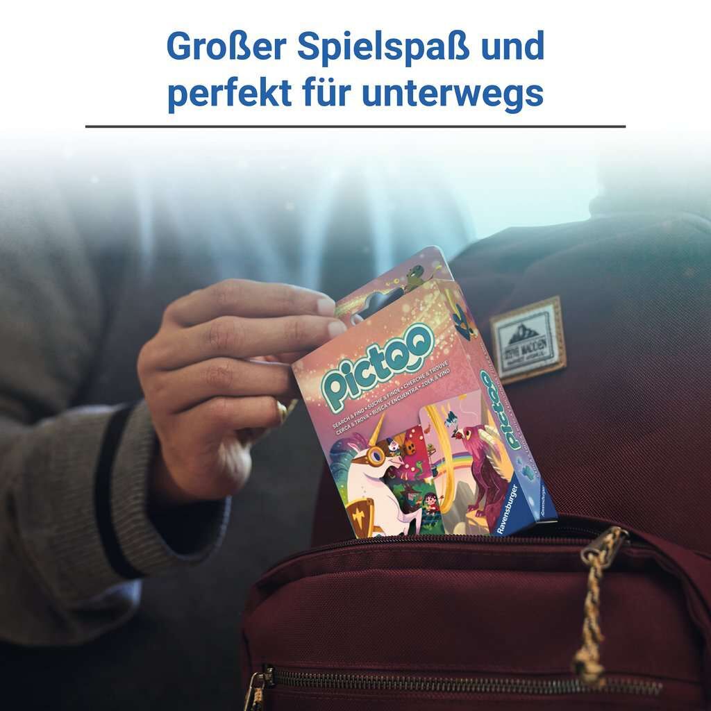 Bei diesem schnellen Kartenspiel sind auf 57 großen Wimmelbild-Karten Schätze und Fabelwesen aus dem märchenhaften Land der Fantasie versteckt. Jeder erhält fünf Karten, die er offen vor sich ablegt. Die oberste Karte wird vom mittigen Stapel auf das Suchmotiv...