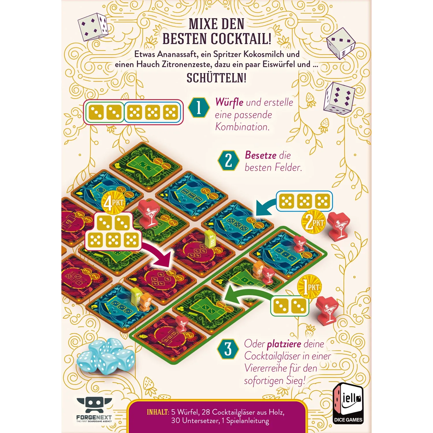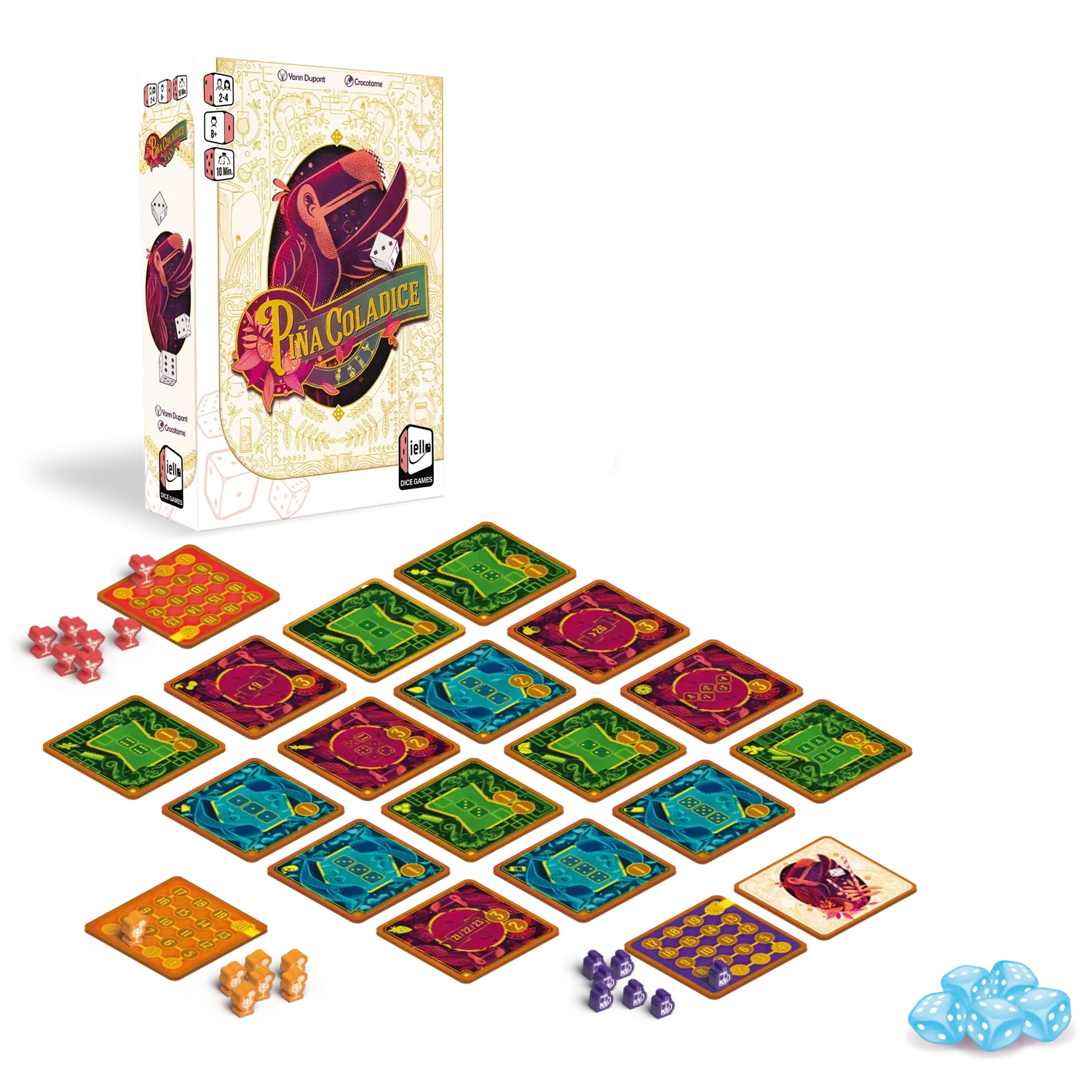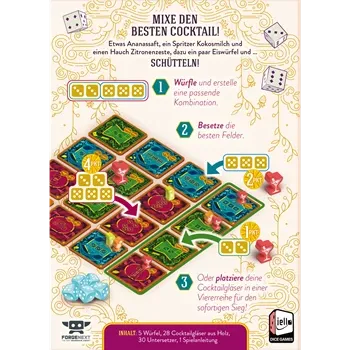 Piña Coladice ist ein Partyspiel für die ganze Familie. Würfelt bis zu dreimal und platziert eure beste Kombination auf einem der Untersetzer. Sammelt Punkte und nähert euch dem Sieg! Manchmal sind aber die schnellen Cocktails die besten - wenn du 4 deiner Coc...