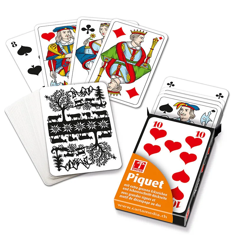 Jasskarten mit französischen Motiven und extra grossen Zahlen/Eckzeichen. Rückseiten mit original Scherenschnittmotiven von Jolanda Brändle. Jasskarten sind in stabiler Faltschachtel verpackt.