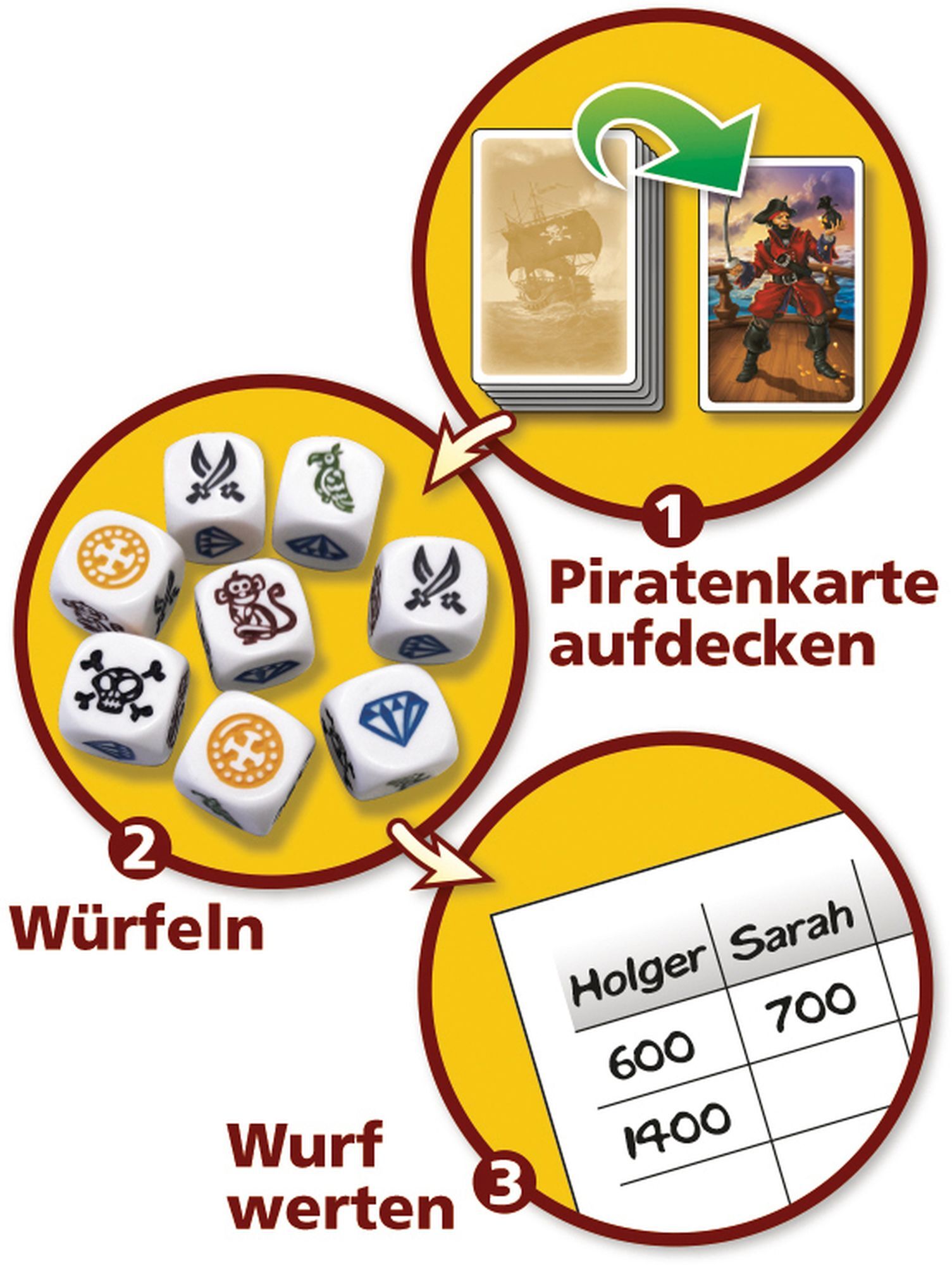 Piraten Kapern Ein aufregendes Spiel der neuen AMIGO Würfelspiel-Reihe! Einmal im Jahr treffen sich die Piraten auf der Totenkopfinsel und erzählen sich die neuesten Geschichten. Bei "Piraten Kapern" gilt es als Pirat, möglichst viele Schätzte zu erg...