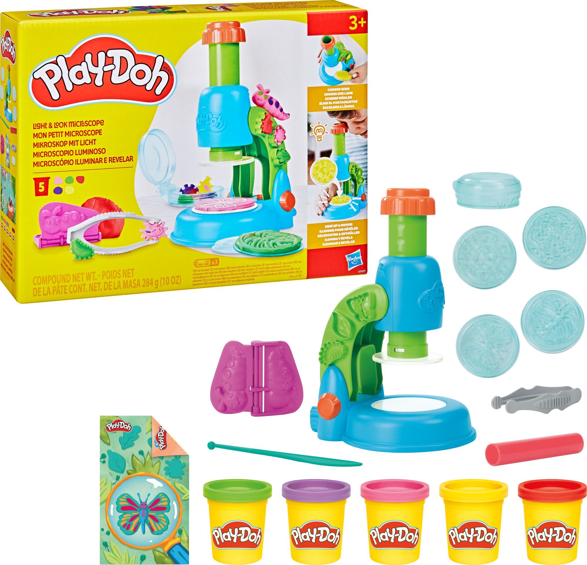 Play-Doh Mikroskop Mit Licht Mit dem Play-Doh Mikroskop kann das Wunder der Wissenschaft und die eigene Fantasie erstrahlen. Das aufleuchtende Spiel-Mikroskop lässt die Kreationen der Kinder auf den 4 transparenten Objektträgern erleuchten. Einfach eine Scheib...
