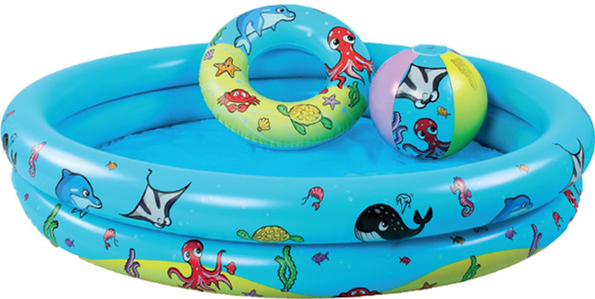 Perfektes Paket für diesen Sommer mit einer Kombination aus 1 Pool (ca. 122 cm), 1 Strandball und 1 kleinen Schwimmring (ca. 46 cm)zum Spielen! Alle im gleichen Design!