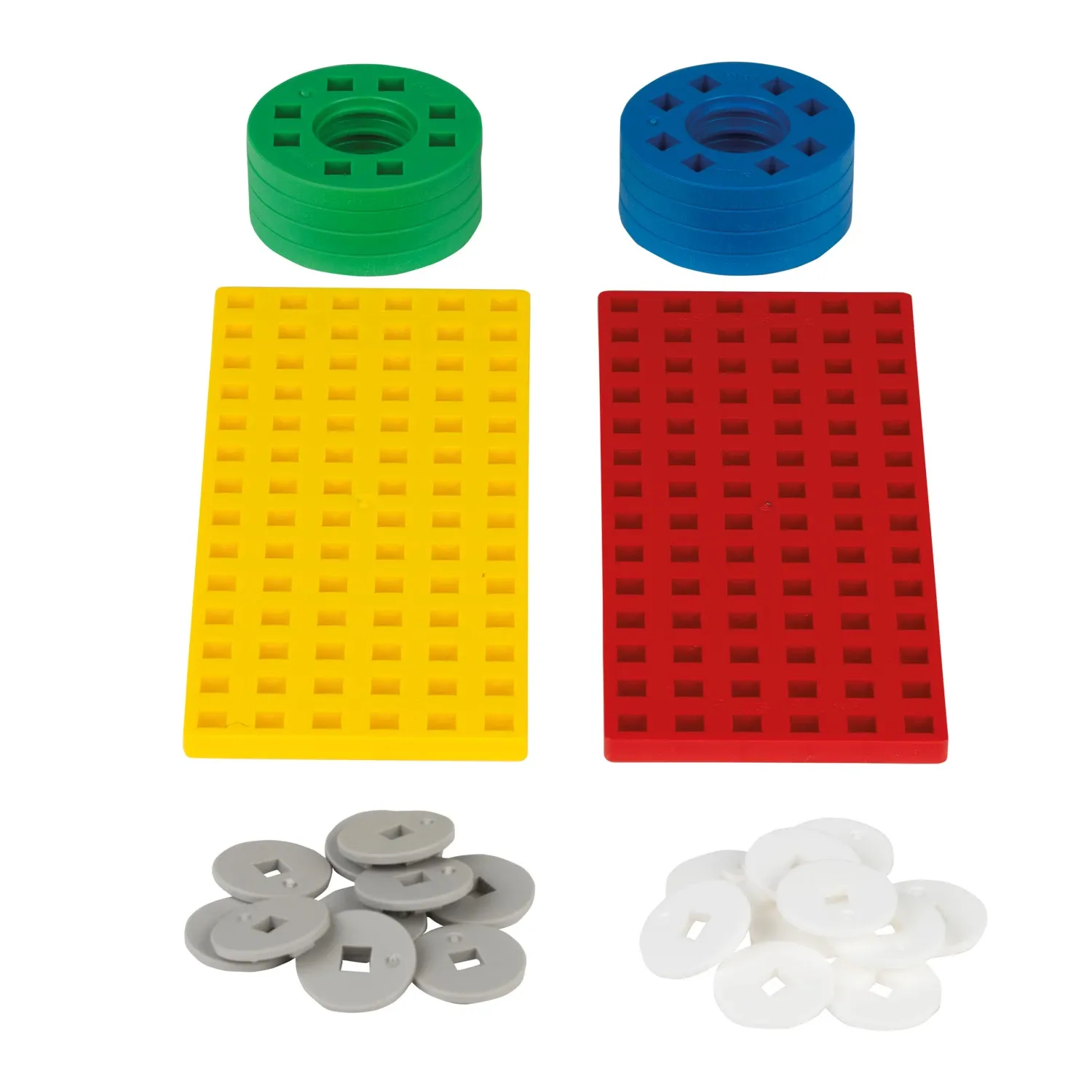 Dieses Zubehörset enthält 2 Grundplatten (1x rot und 1x gelb) sowie 8 Räder in grün und blau und 16 Naben in weiss und grau. Perfekte Ergänzung für die GO! Reihe